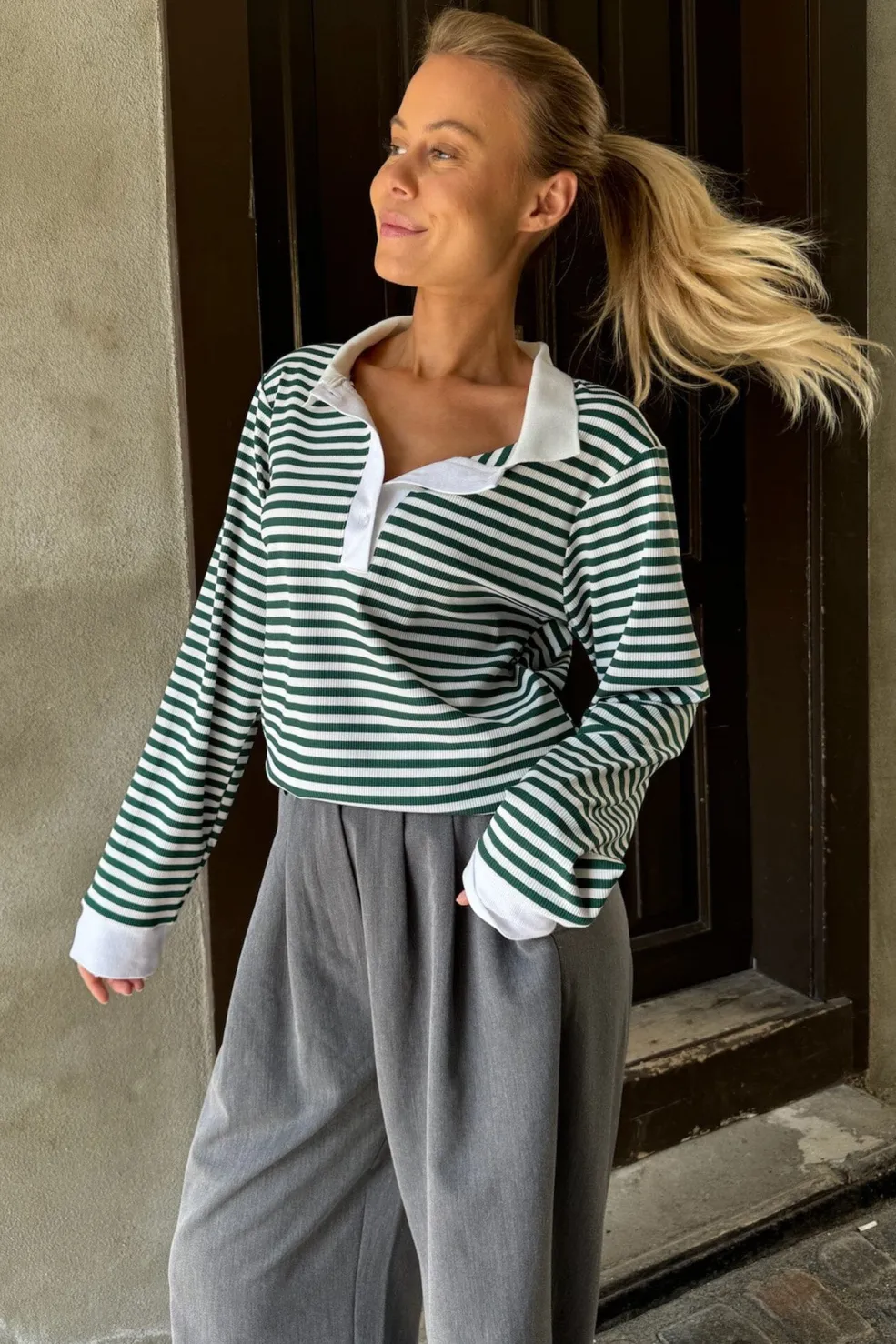 Stribet polo fra BYIC med grønne og hvide striber. Den har en klassisk polokrave og lange ærmer med flæsedetaljer, der giver et maritimt præg til designet.