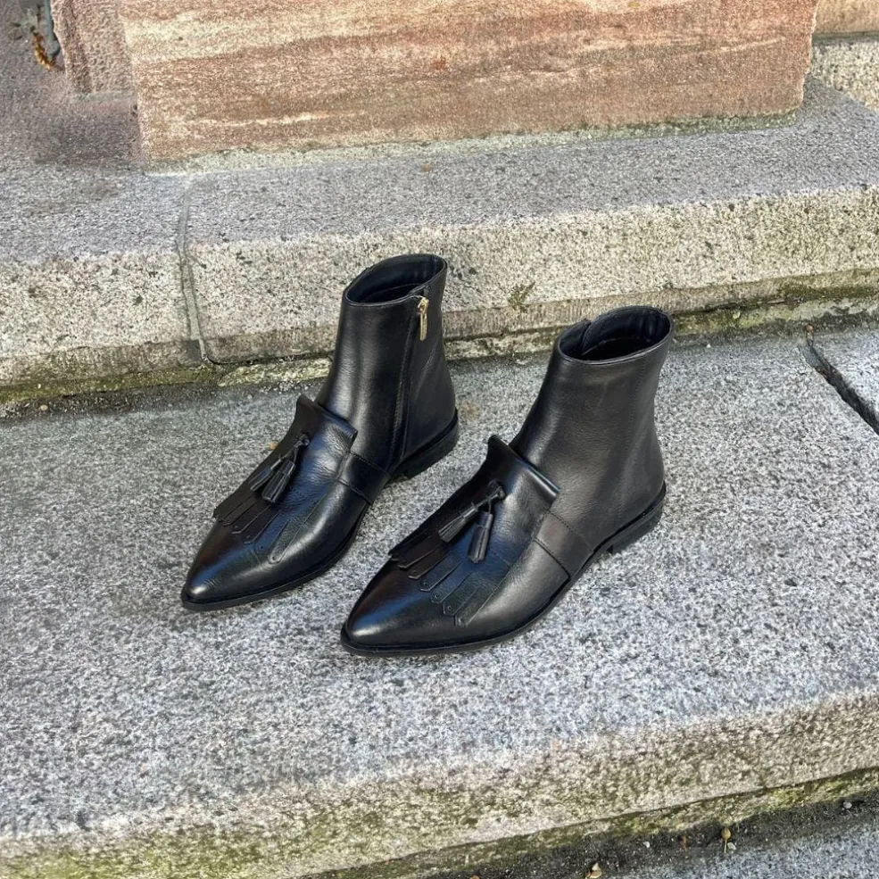 Sorte ankelstøvler fra Copenhagen Shoes, lavet af læder med kvastdetaljer på forsiden og spidse snuder.