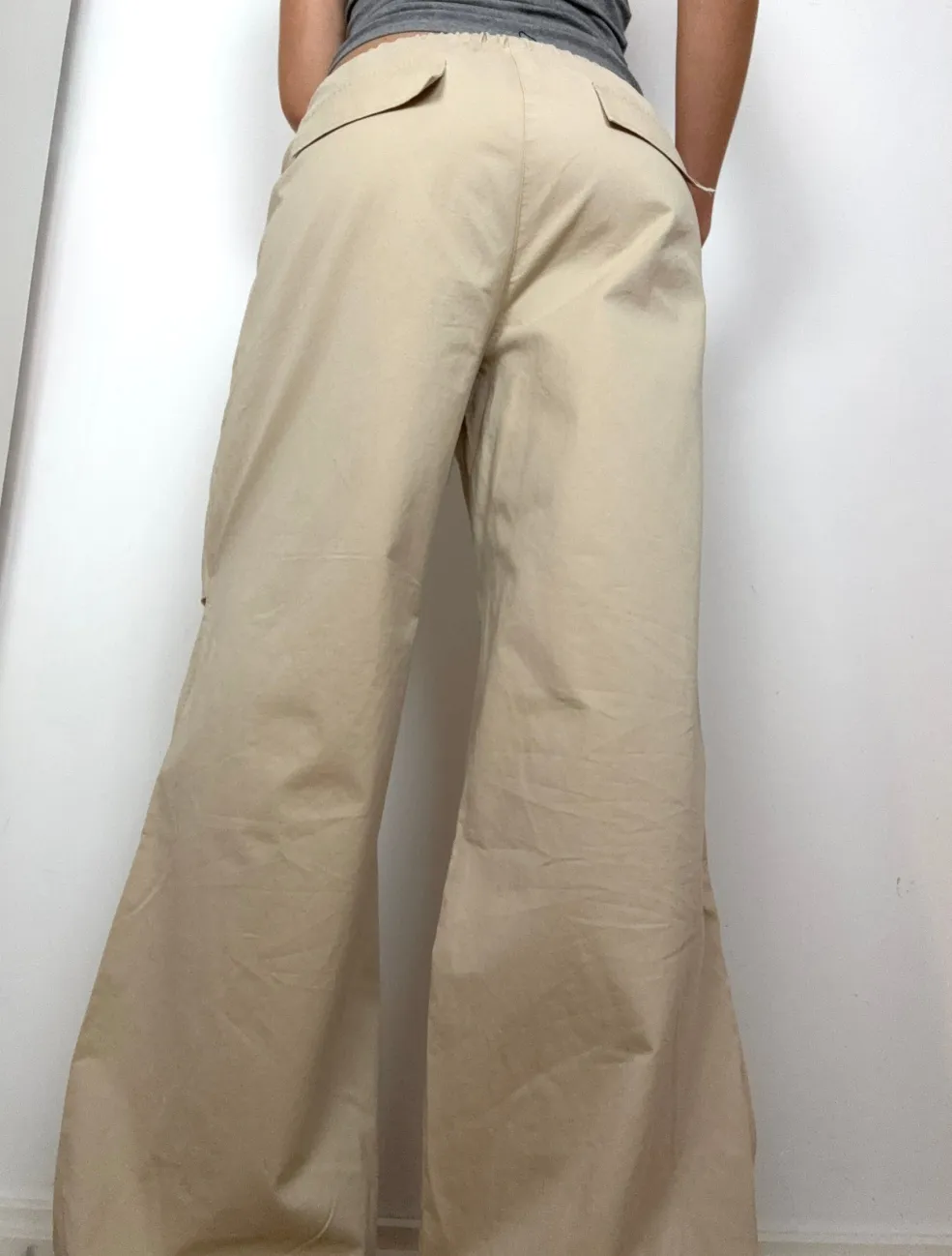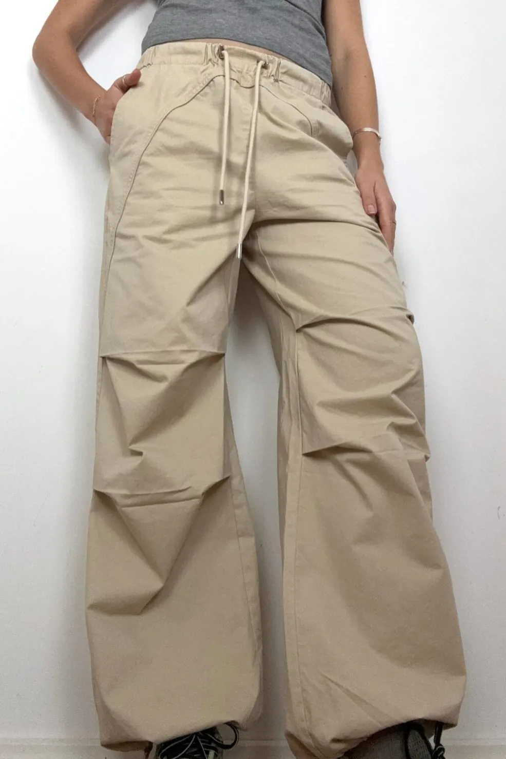 Beige bukser fra Continue i en sandfarvet nuance. Bukserne har en løs pasform med dekorative syninger og snøredetaljer i taljen.