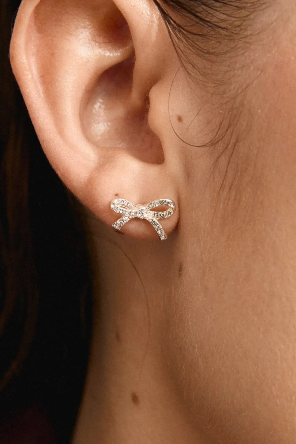 Sølvbelagte øreringe fra Pilgrim med sløjfeform og klare krystaller. Øreringene har en sikker og behagelig pasform med et let design.