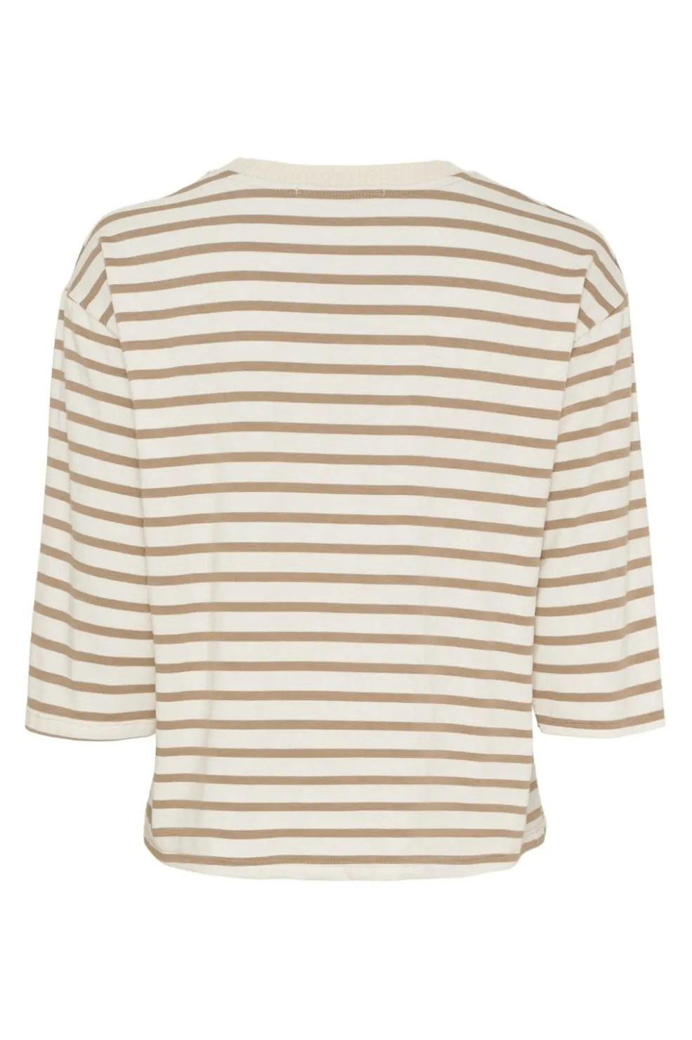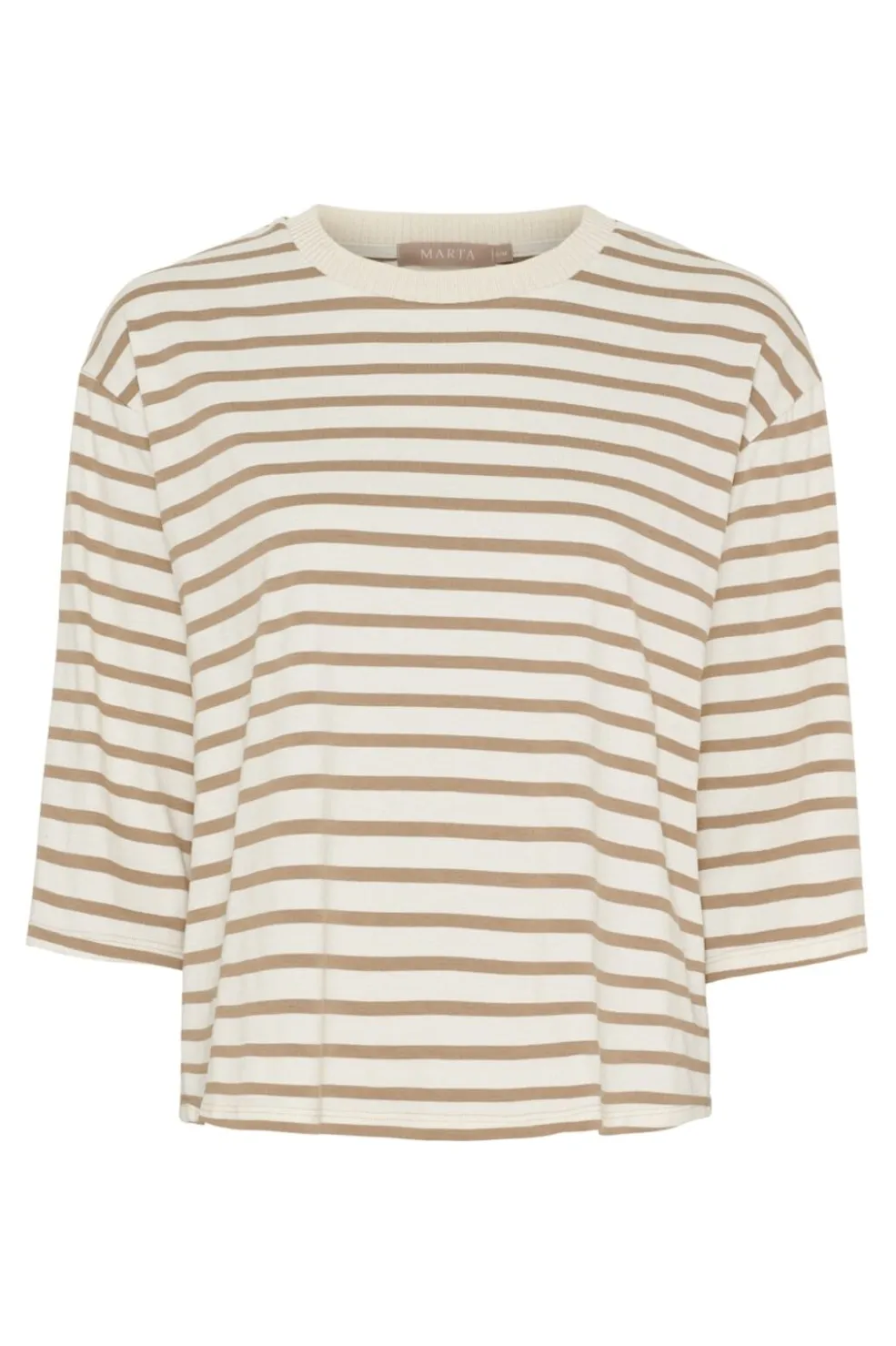 Stribet t-shirt fra Marta Du Chateau i beige og brune nuancer. T-shirten har en løs pasform med 3/4 ærmer og rund hals.