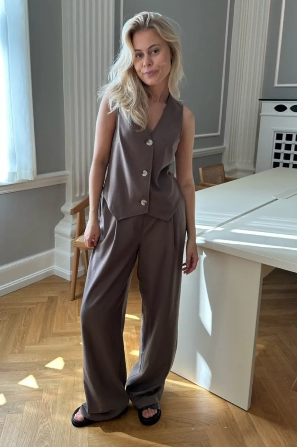 Brun vest fra BYIC med V-udskæring og tre knapper foran. Den ærmeløse vest har en slim fit-pasform og kan styles sammen med Celina-bukserne.