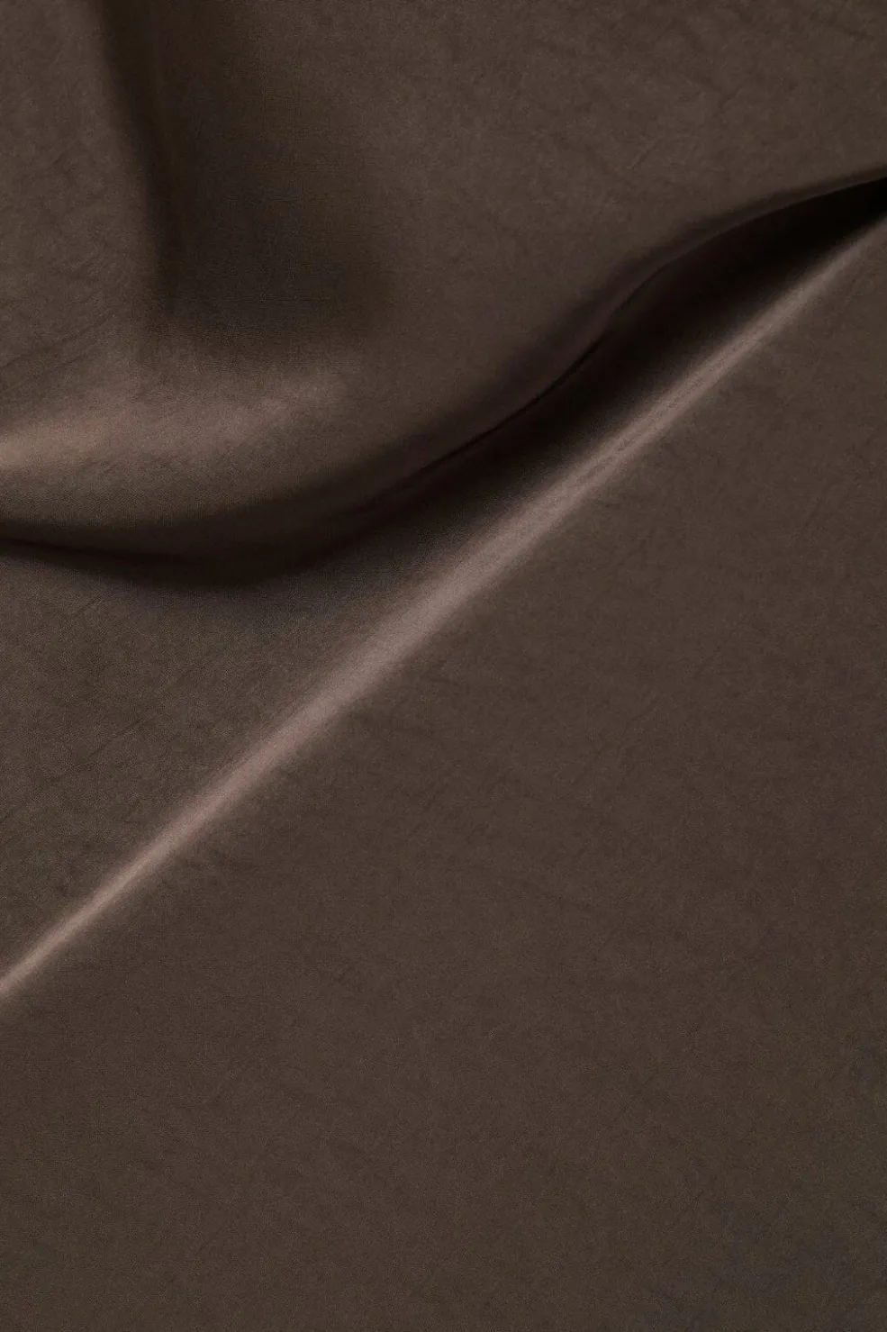 Lang kjole fra Neo Noir i mørkebrun satin. Den har høj hals, ærmeløst design og en nøglehul-detalje i ryggen.