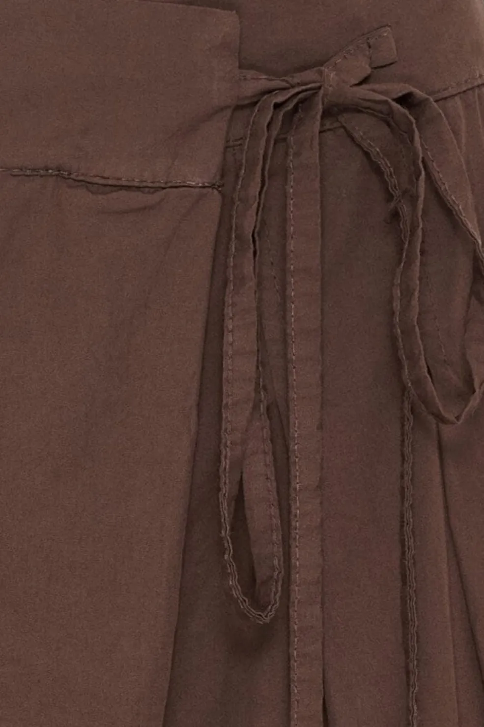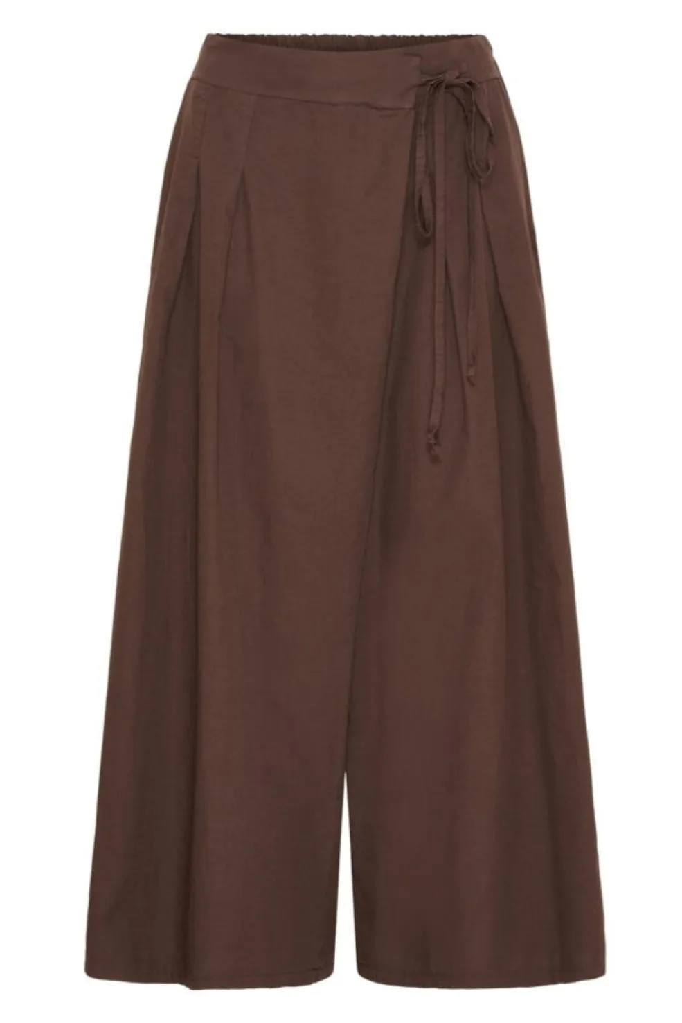 Brune bukser fra Marta Du Chateau i kalvelængde. Bukserne har en høj talje med snøre og elastik samt en løs pasform, der giver god bevægelighed.