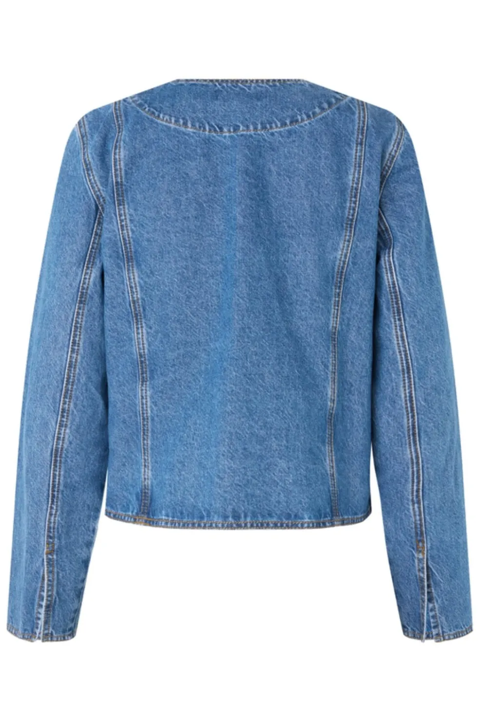 Denimjakke fra Global Funk i en vintage blå vask. Jakken har et wrap-design med bindebånd i taljen og en V-halsudskæring. De dekorative syninger giver jakken et rustikt præg.