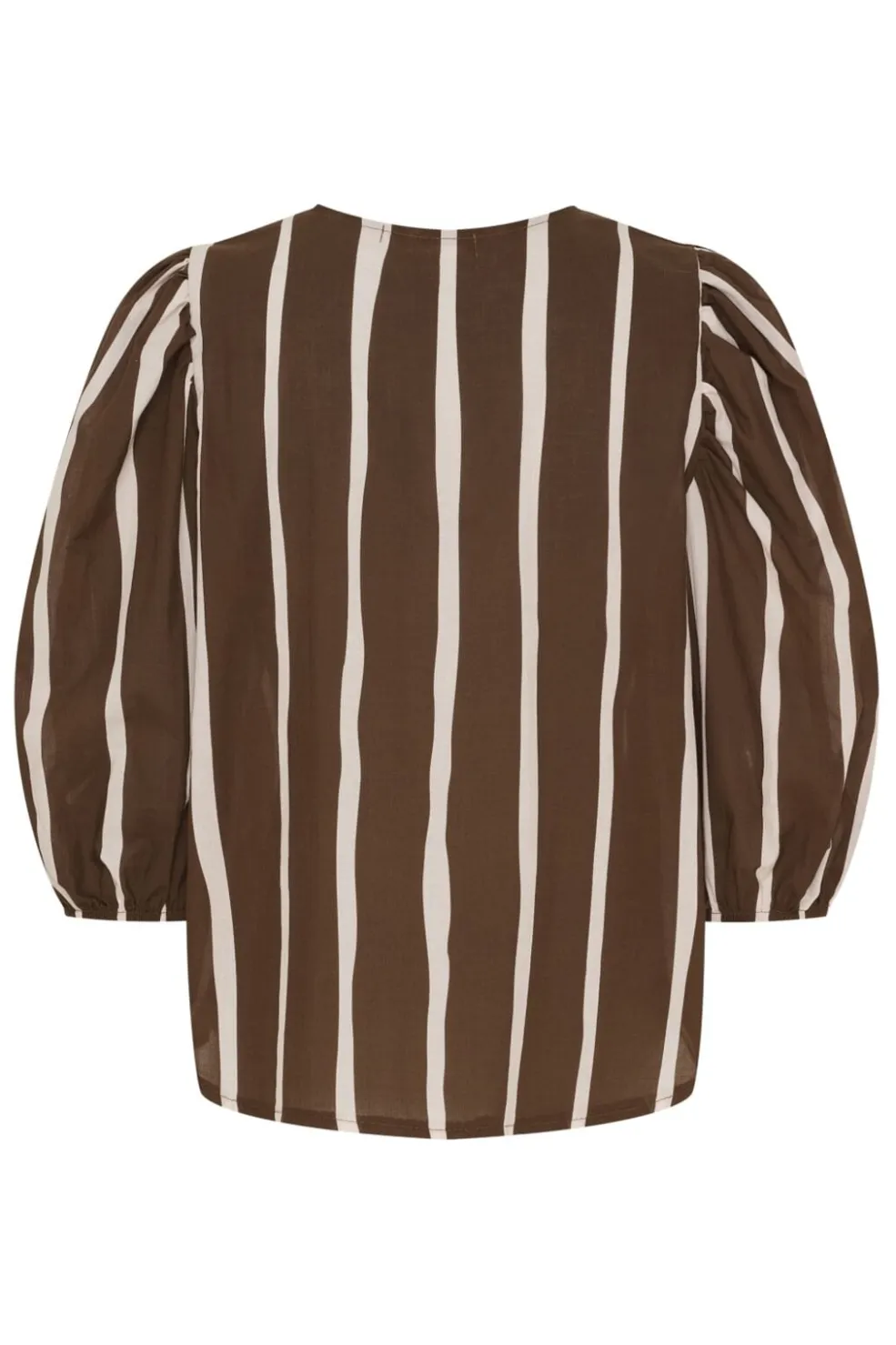 Stribet skjorte fra Marta Du Chateau i brun og hvid. Den har rund hals og 3/4 ærmer med puf. Knapperne foran gør den nem at tage af og på.