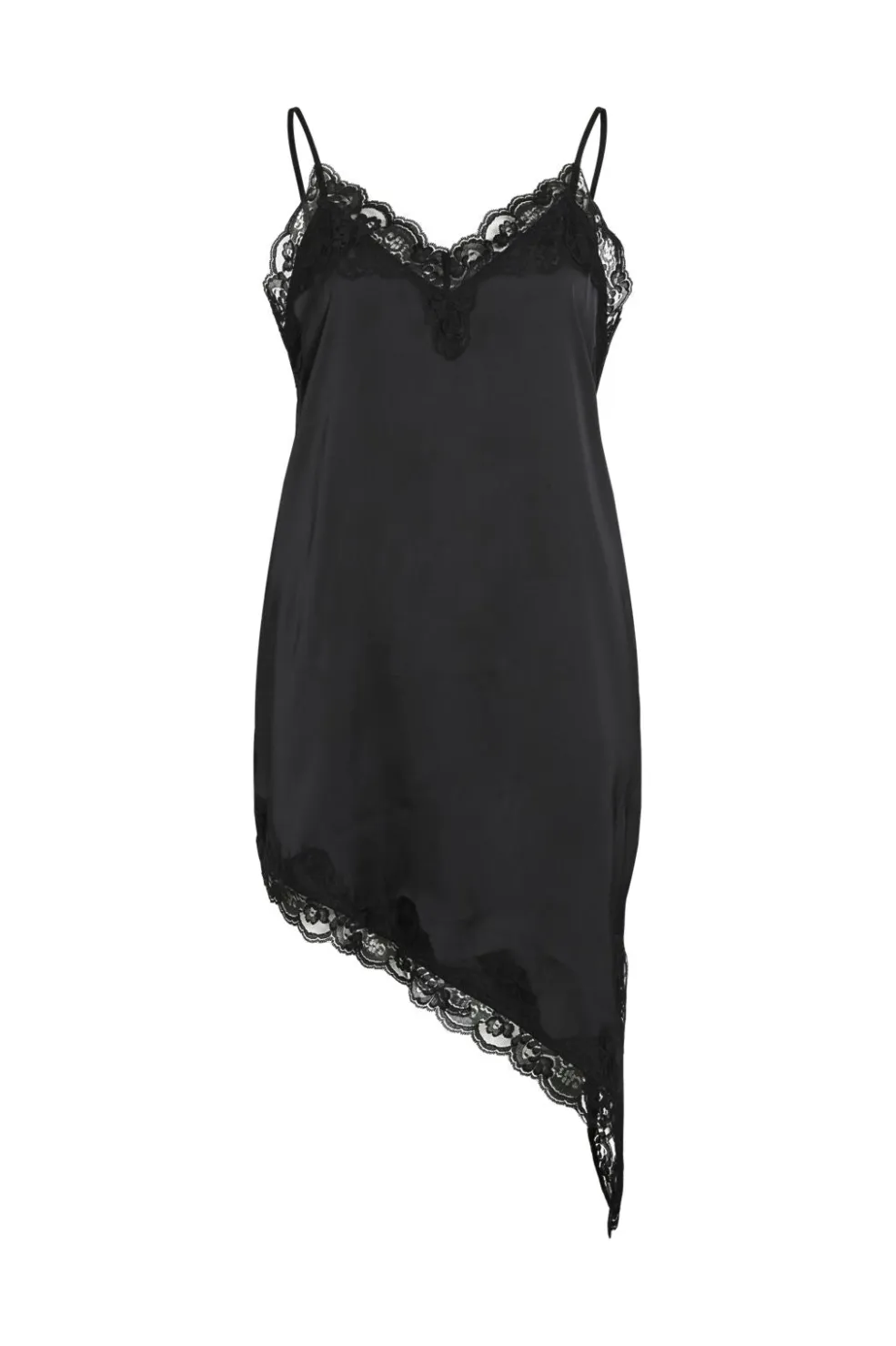 Sort kjole fra Vila med tynde stropper og blondekant. Kjolen har V-udskæring og asymmetrisk kant, der giver den et unikt snit. Den er fremstillet af genanvendt polyester.