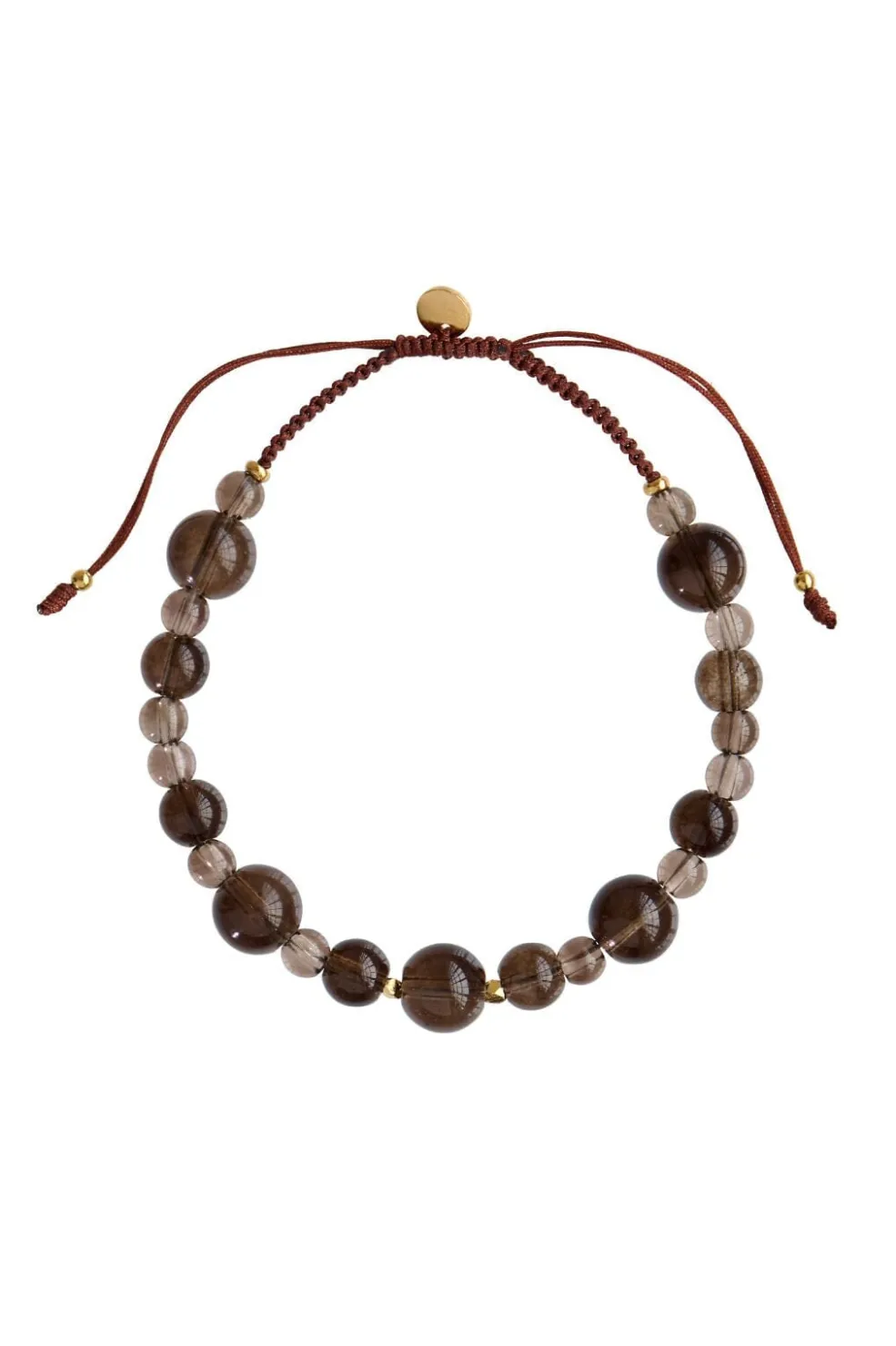 Et armbånd fra Stine A med gennemsigtige, brune kugler i varierende størrelser. Armbåndet har en brun snor og gyldne detaljer ved enderne.