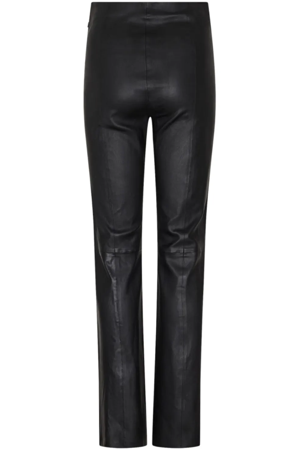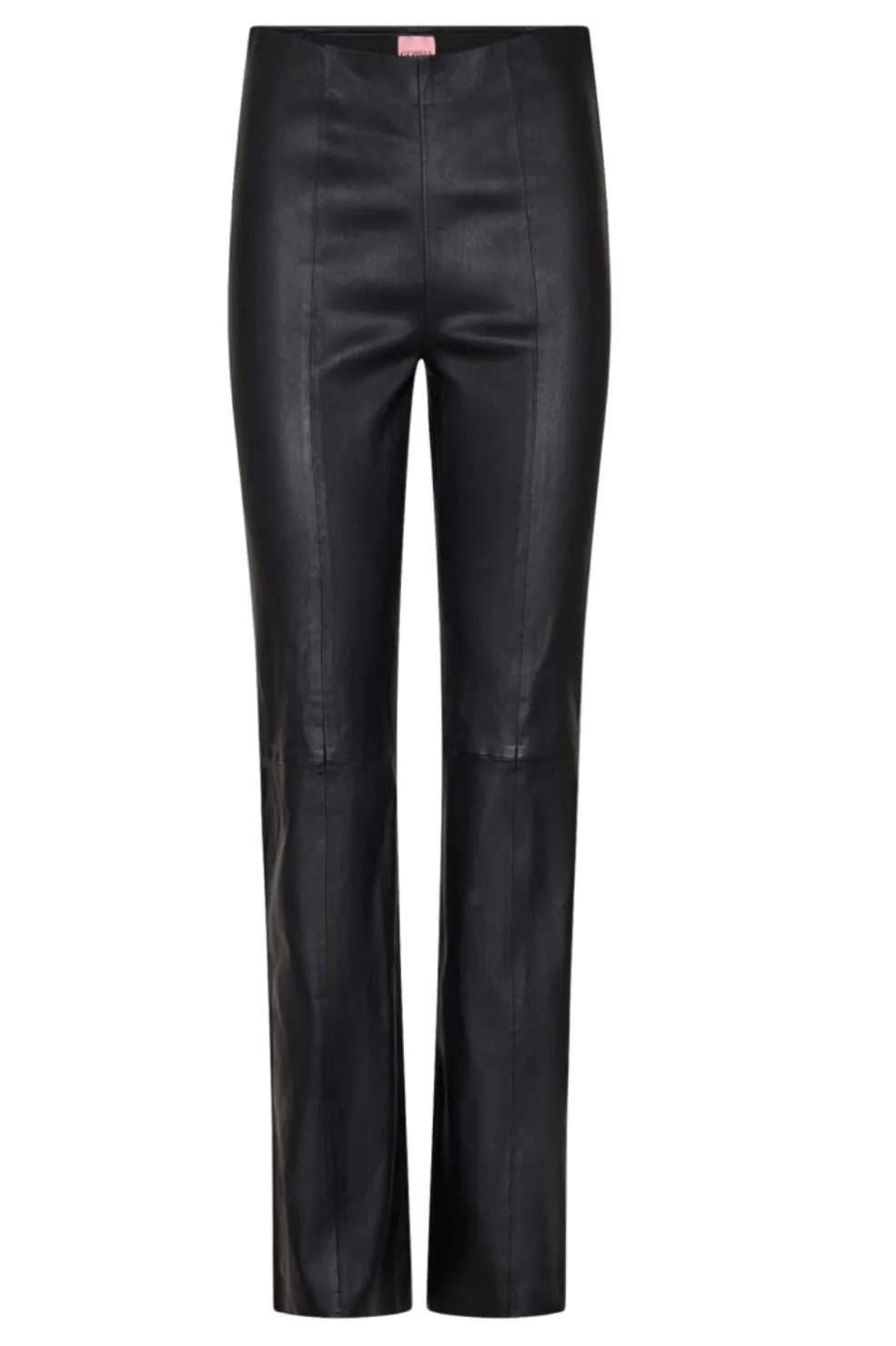 Sorte stretchbukser fra Gossia i blødt lammeskind. Bukserne har en tætsiddende pasform med elastik i taljen og dekorative syninger.