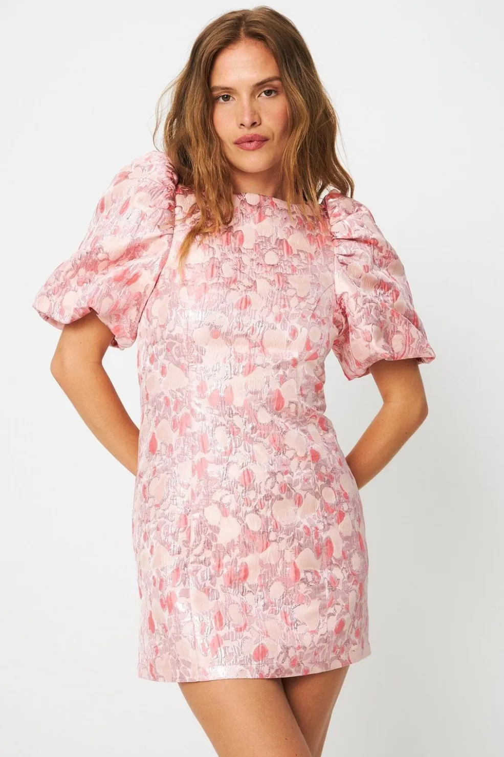 Kort kjole fra Cras i metallisk pink med blomstermønster. Kjolen har en høj hals og puffede ærmer med flæser. Stoffet har en skinnende overflade med et gennemgående blomsterprint.
