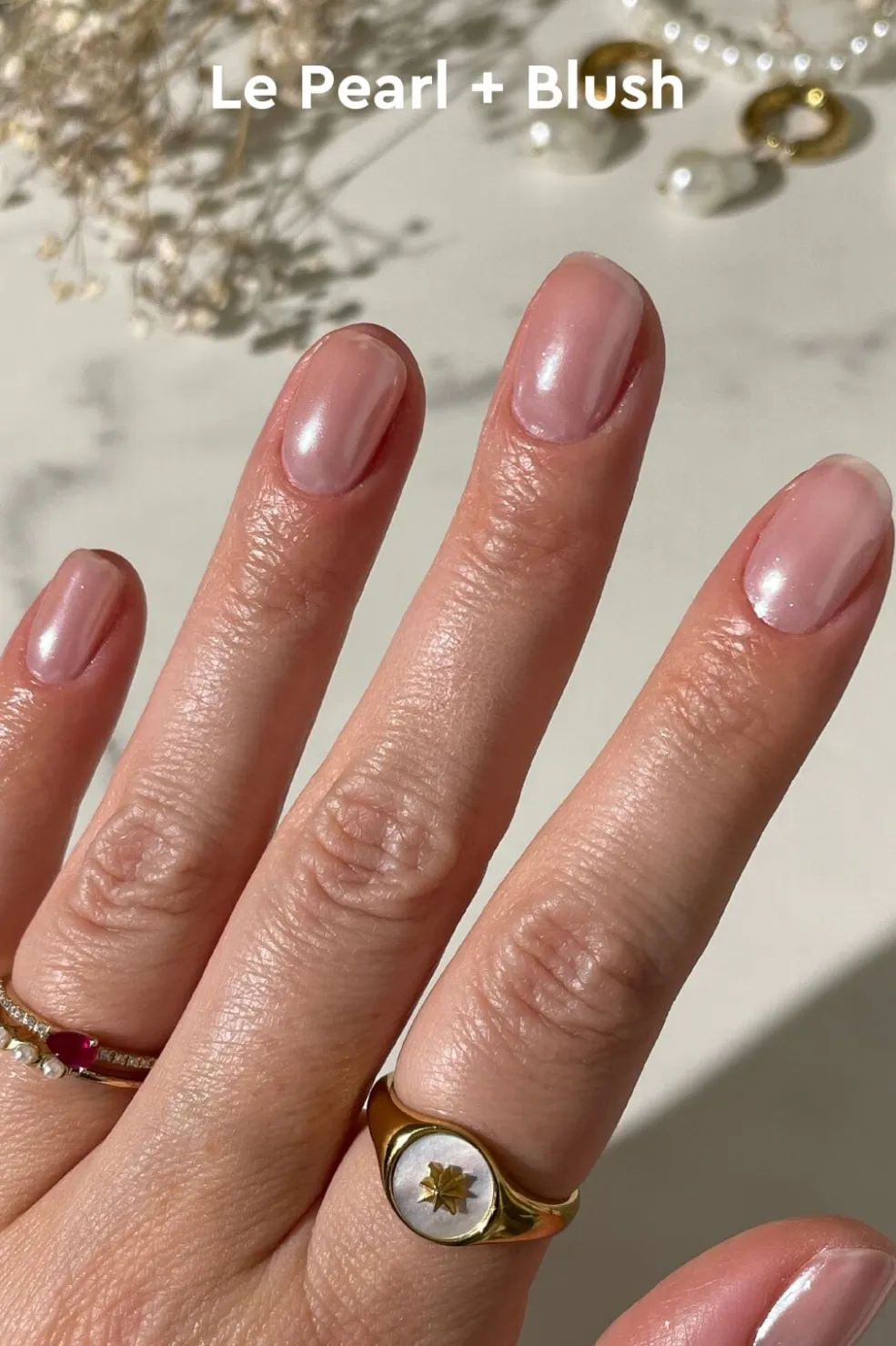 Et krompulver-sæt til negle med perlemorsfinish. Sættet indeholder et hvidt perlemorspulver og en topcoat på 4 ml til at forsegle den blanke finish.