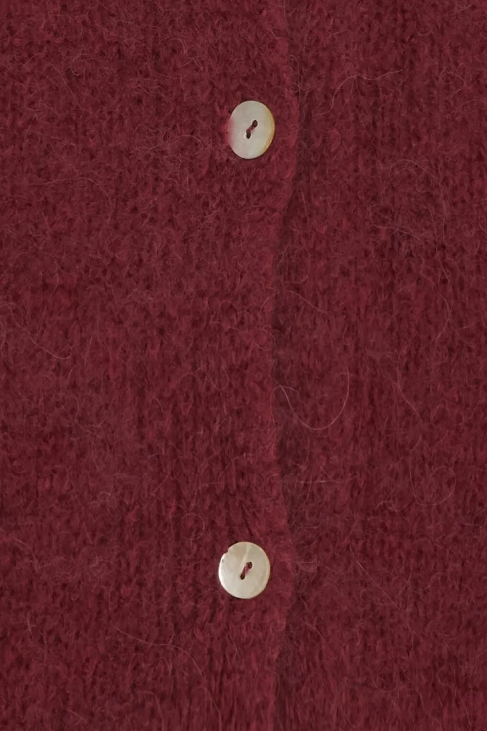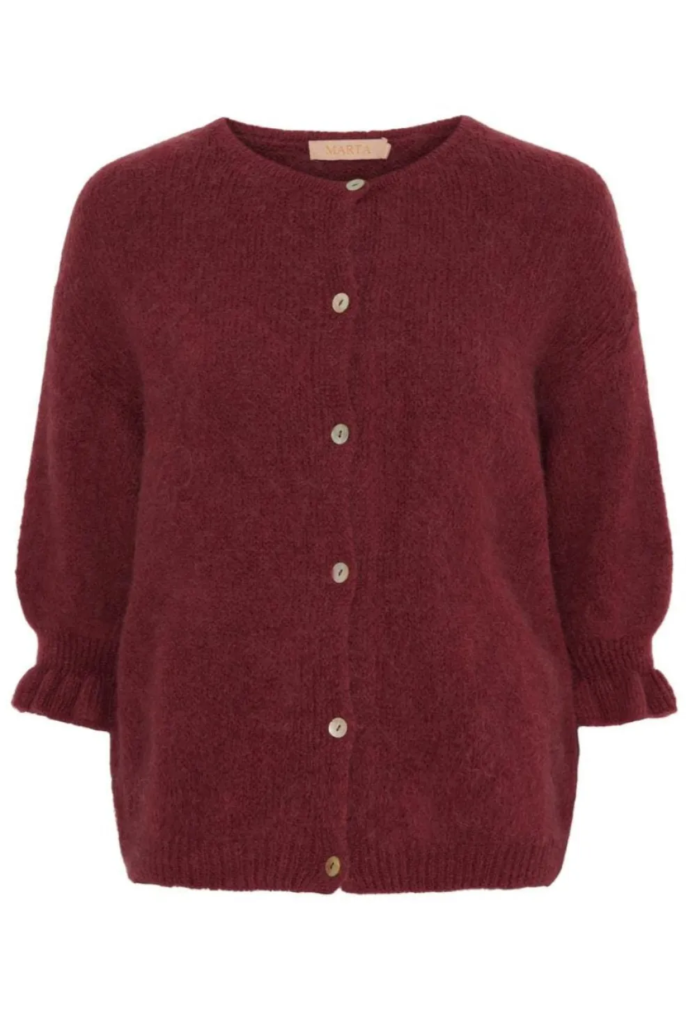 Strikket cardigan fra Marta Du Chateau i en dyb vinrød farve. Den har knaplukning foran og 3/4-ærmer med flæsekanter ved ærmegabene.