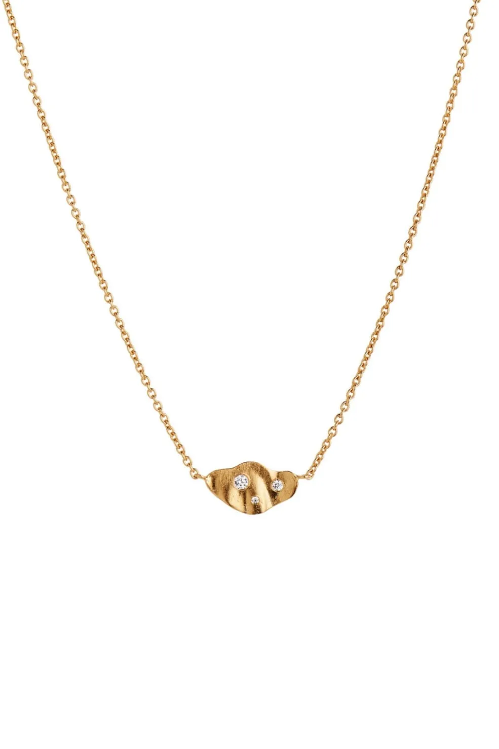 Guldfarvet halskæde fra Stine A med en fin kæde og vedhæng. De to hvide zirkoner i vedhænget skaber et diskret og dekorativt udtryk på den tynde kæde.
