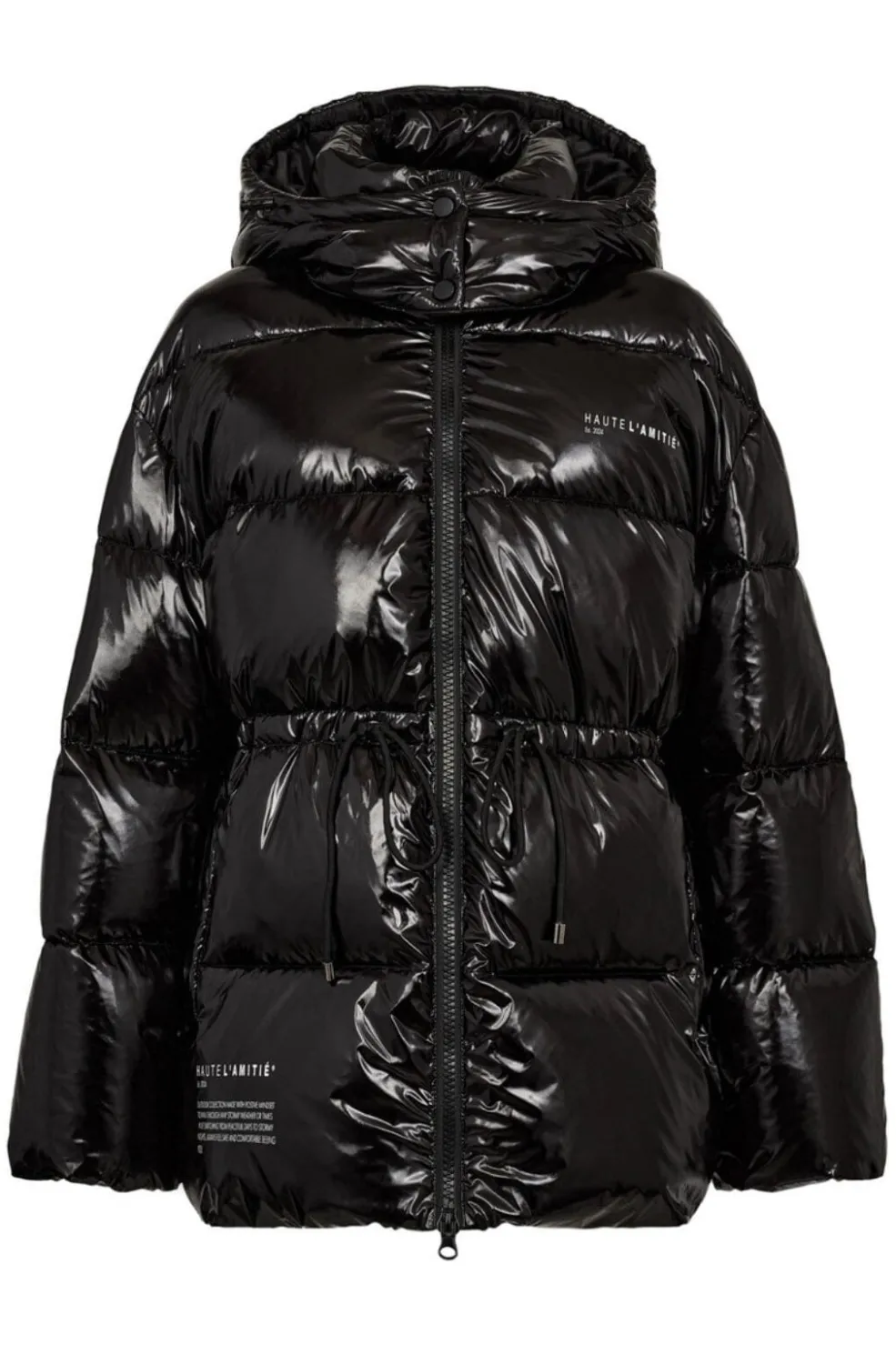 Sort pufferjakke fra Haute L’Amitié, lavet af 100 % nylon med en skinnende overflade. Jakken har en lynlås foran og synlige snoretræk i taljen.