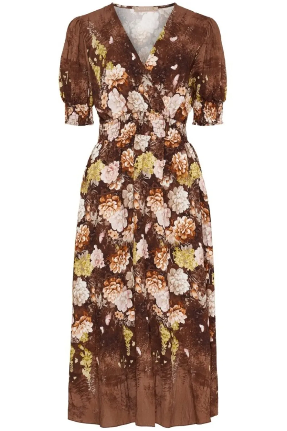 Brun kjole fra Marta Du Chateau med blomstermønster. Kjolen har V-hals, pufærmer og smock i taljen. Den går til midt på læggen og har dekorative syninger og flæser.