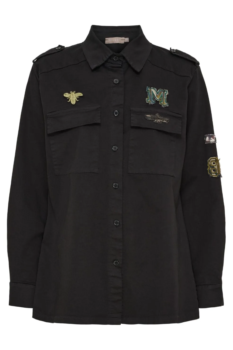 Sort jakke fra Marta Du Chateau med skjortekrave og knapper. Den har broderede patches med bi og M-logo samt dekorative skulderlapper, der giver et militærinspireret udtryk.