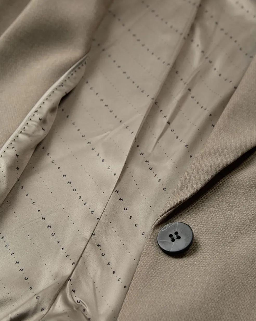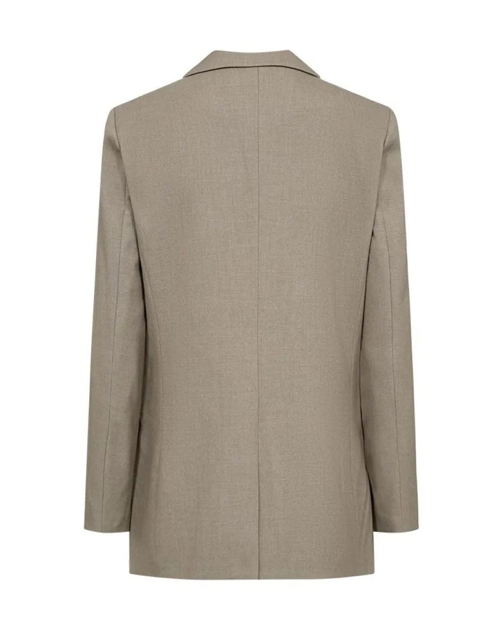 Skræddersyet blazer fra Copenhagen Muse i en beige-grøn meleret farve. Jakken har brede skuldre, V-udskæring med revers og en logomønstret foering. Den passer til både formelle, afslappede og festlige lejligheder.