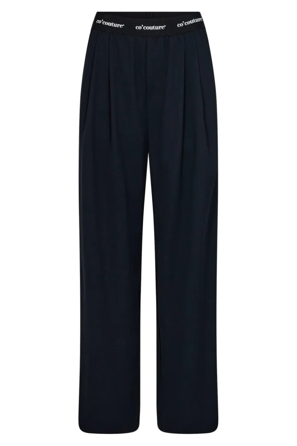 Bukser fra Co´Couture i mørkeblå med plisseringer foran. Den brede elastiske talje har brandets logo, og bukserne kan bruges til både hverdag og fest.