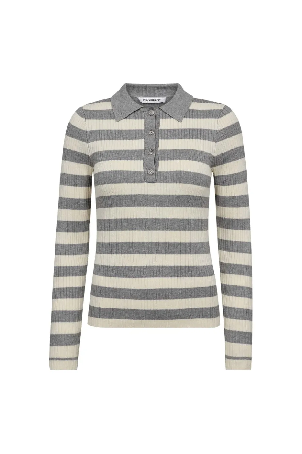 En strikket polo fra Co´Couture i lys grå med striber i grå, hvid og creme. Blusen har en polo-krave med knaplukning foran.