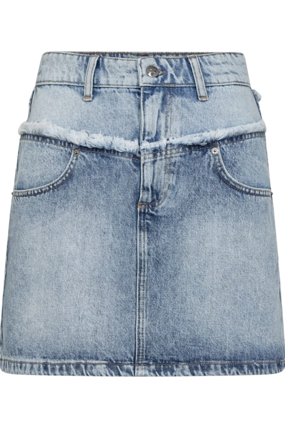Denimnederdel fra Co´Couture i en lys, falmet vask. Den har frayed kant ved taljen og praktiske lommer både foran og bagpå.