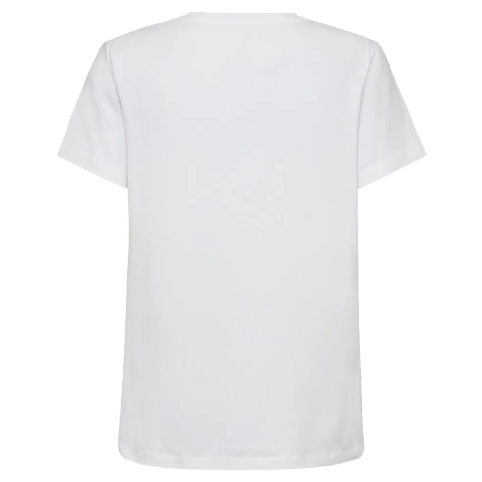 Hvid t-shirt fra Co’Couture med guldfarvet folieprint på forsiden. T-shirten har rund halsudskæring og korte ærmer med dekorative syninger.