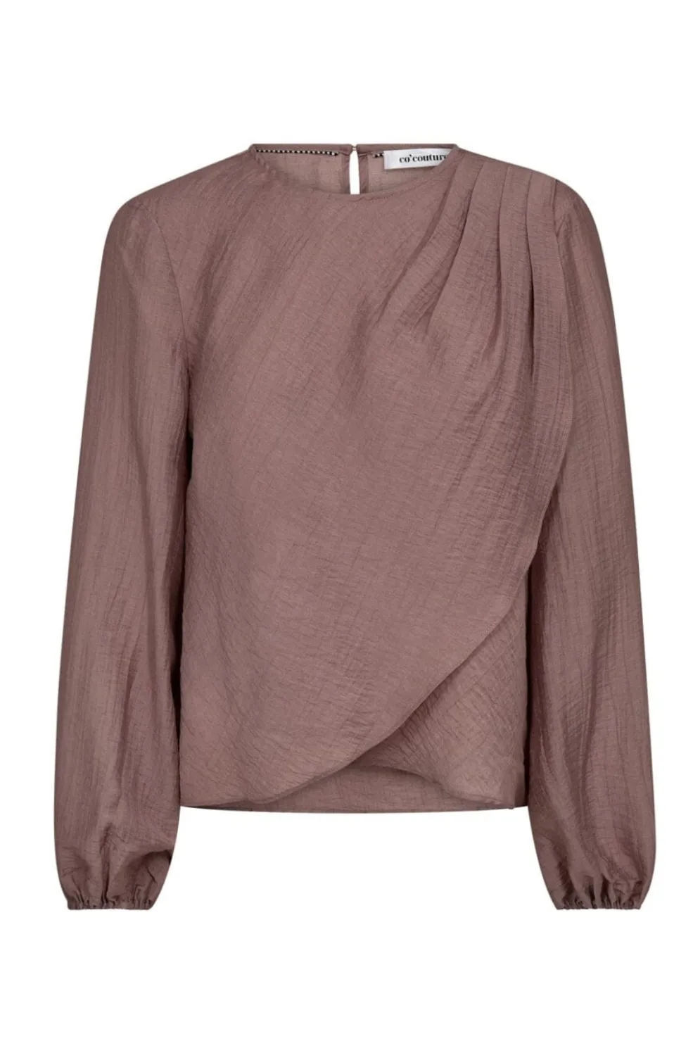 Bluse fra Co´Couture i gammelrosa med et draperet design på forsiden. Blusen har lange ærmer med elastik ved håndleddene og en keyhole-åbning bagpå.