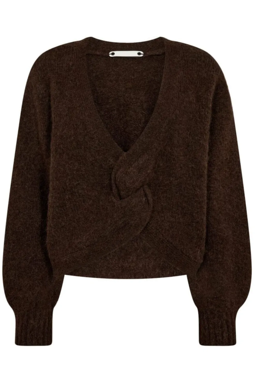 En brun striktrøje fra Co´Couture med et tvistet design foran. Trøjen har V-hals og lange ærmer med ribbede manchetter.