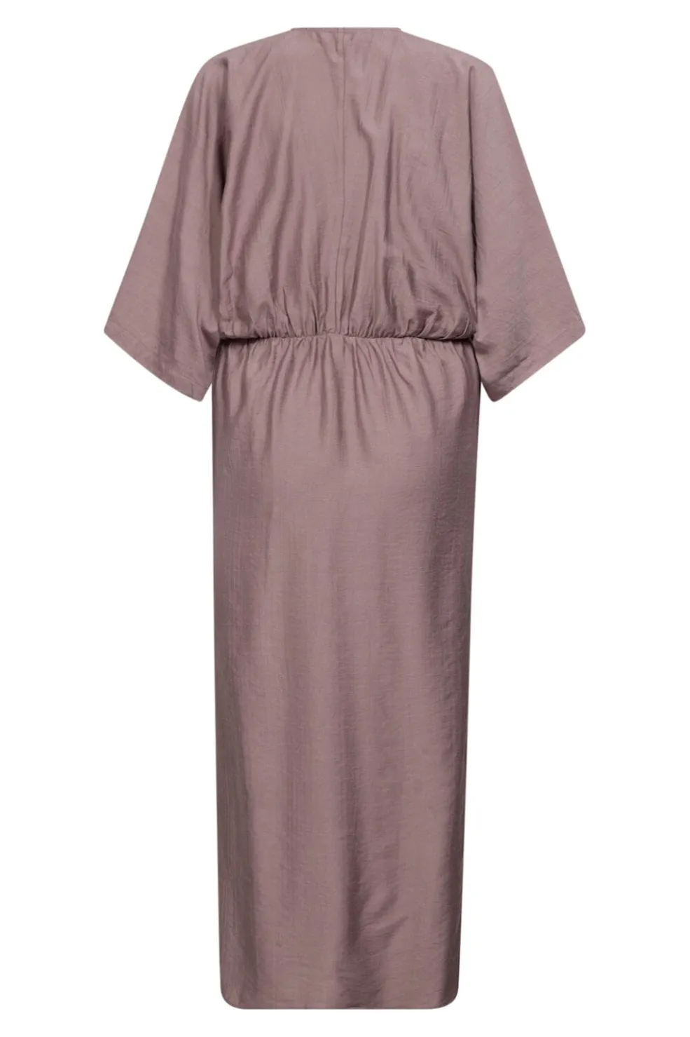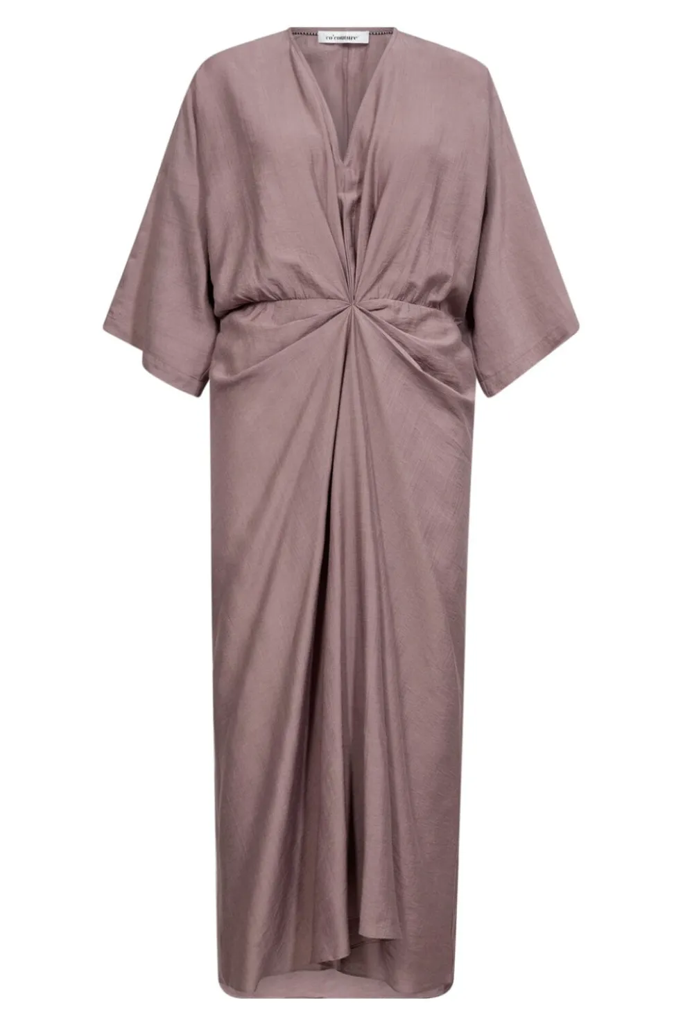 Lang kjole fra Co’Couture i en støvet rosa nuance. Kjolen har en knudedetalje ved taljen og en V-udskæring, der skaber en draperet effekt.