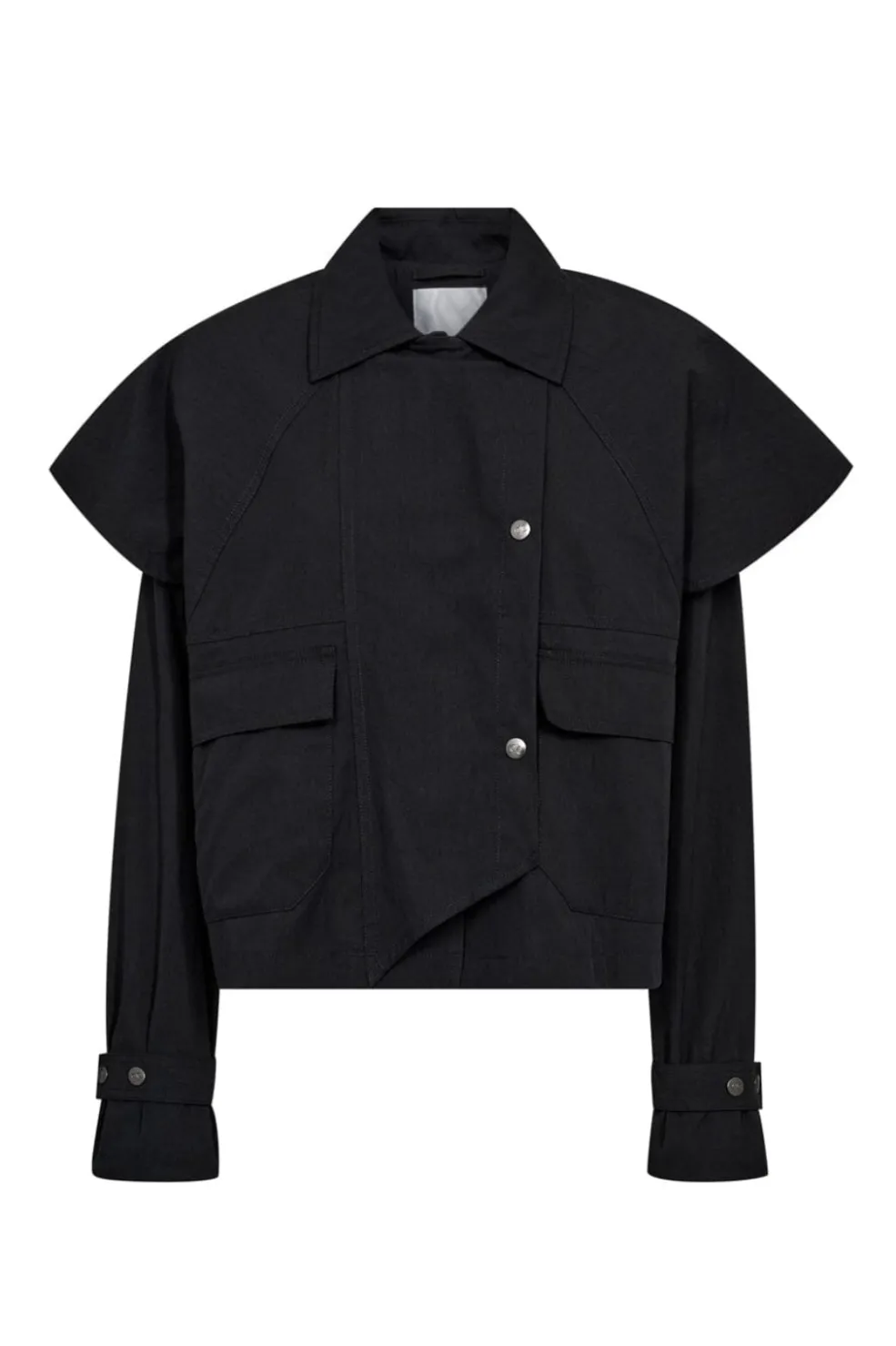 Sort cape-jakke fra Co´Couture med skjortekrave og capedetalje over skuldrene. Jakken har lange ærmer, frontlommer og trykknapper som lukning.