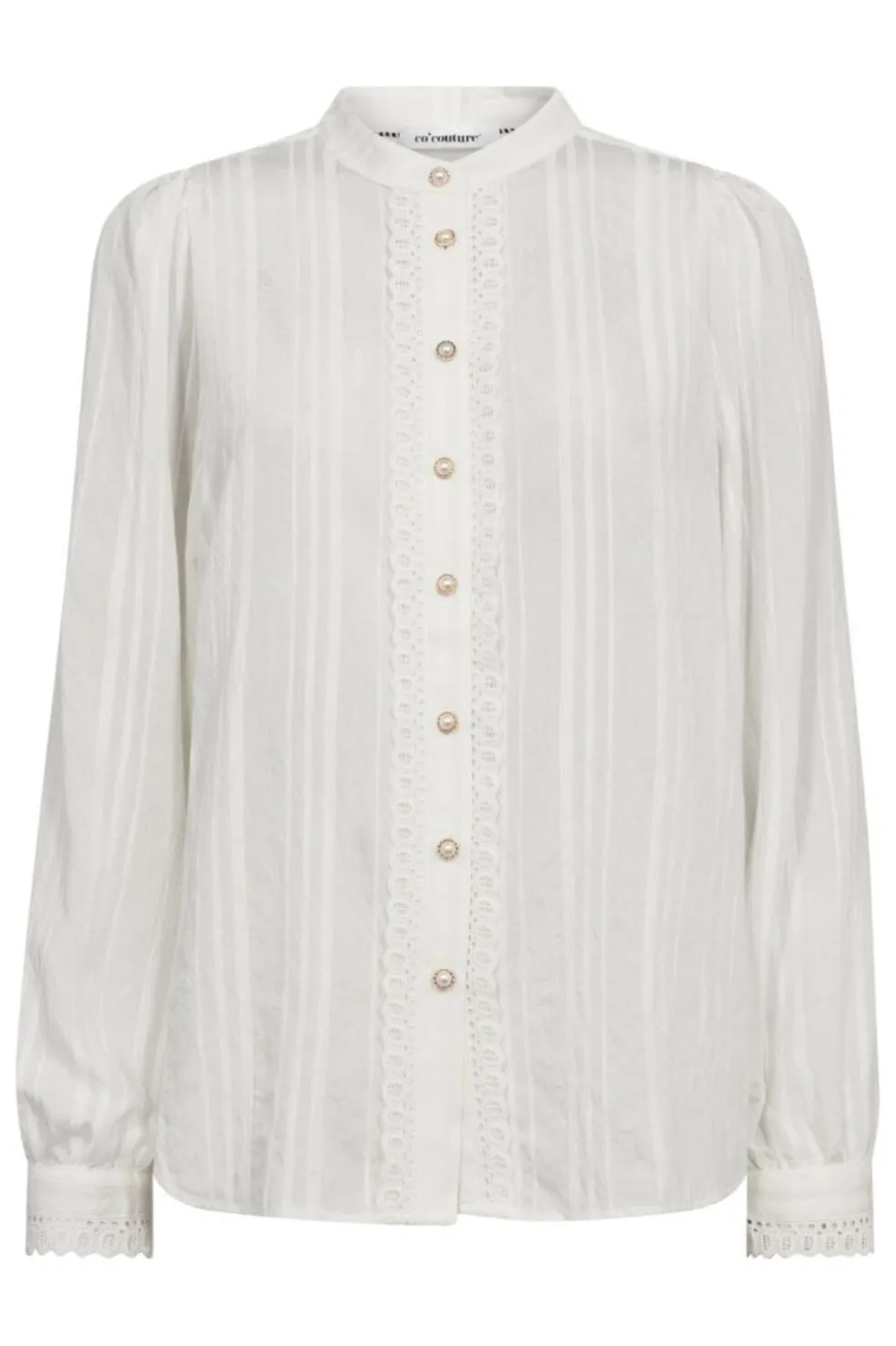 Hvid skjorte fra Co’Couture med striber i stoffet. Skjorten har blondedetaljer langs knaplukningen og ved manchetterne samt små perleknapper, der giver et feminint præg.