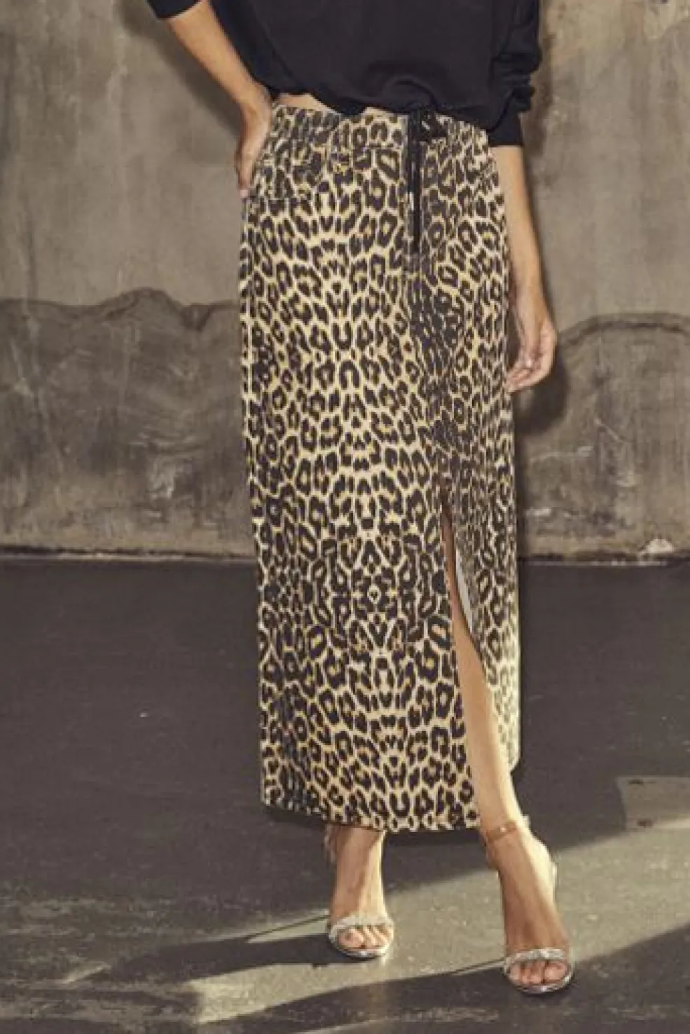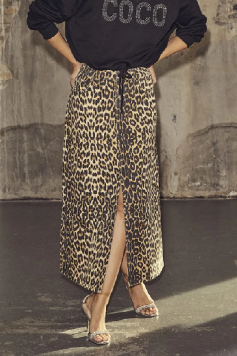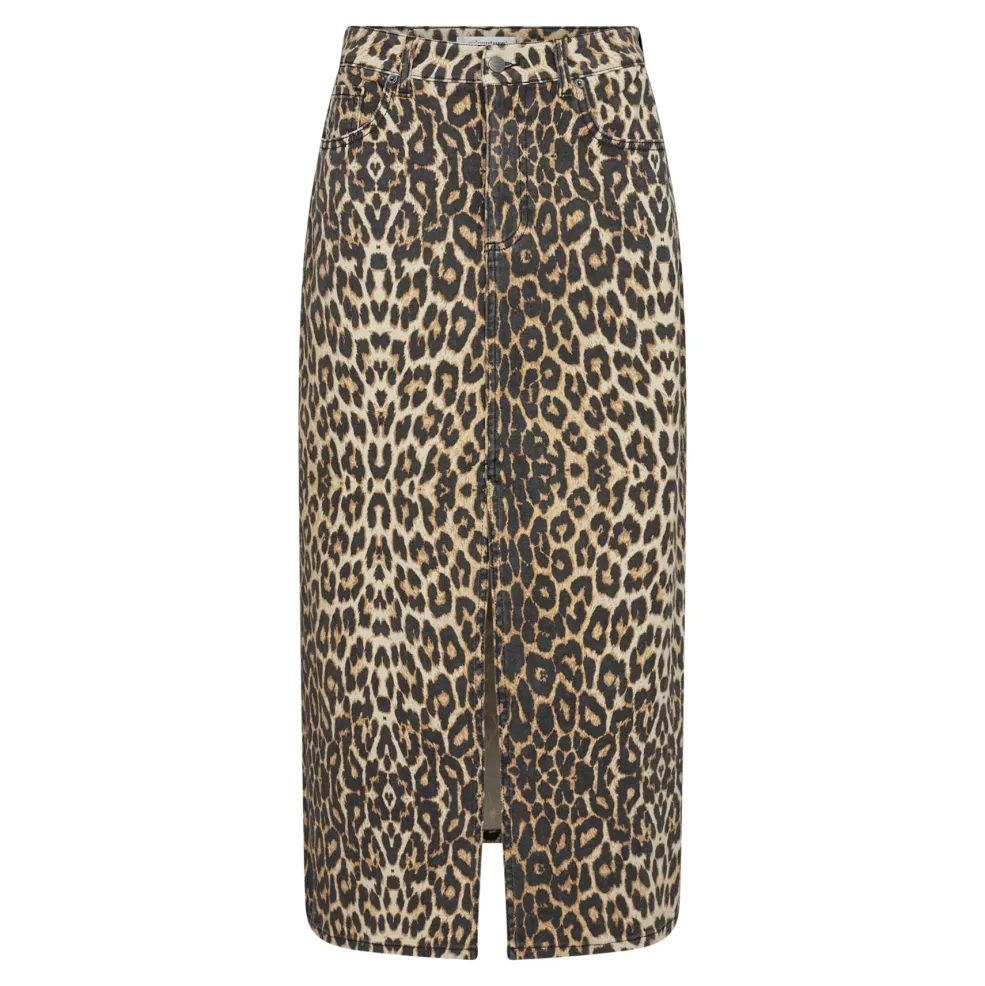 Denimnederdel i khaki med leopardprint og frontslids. Den lange model når til midt på læggen og har en snørelukning i taljen, der giver mulighed for at justere pasformen.
