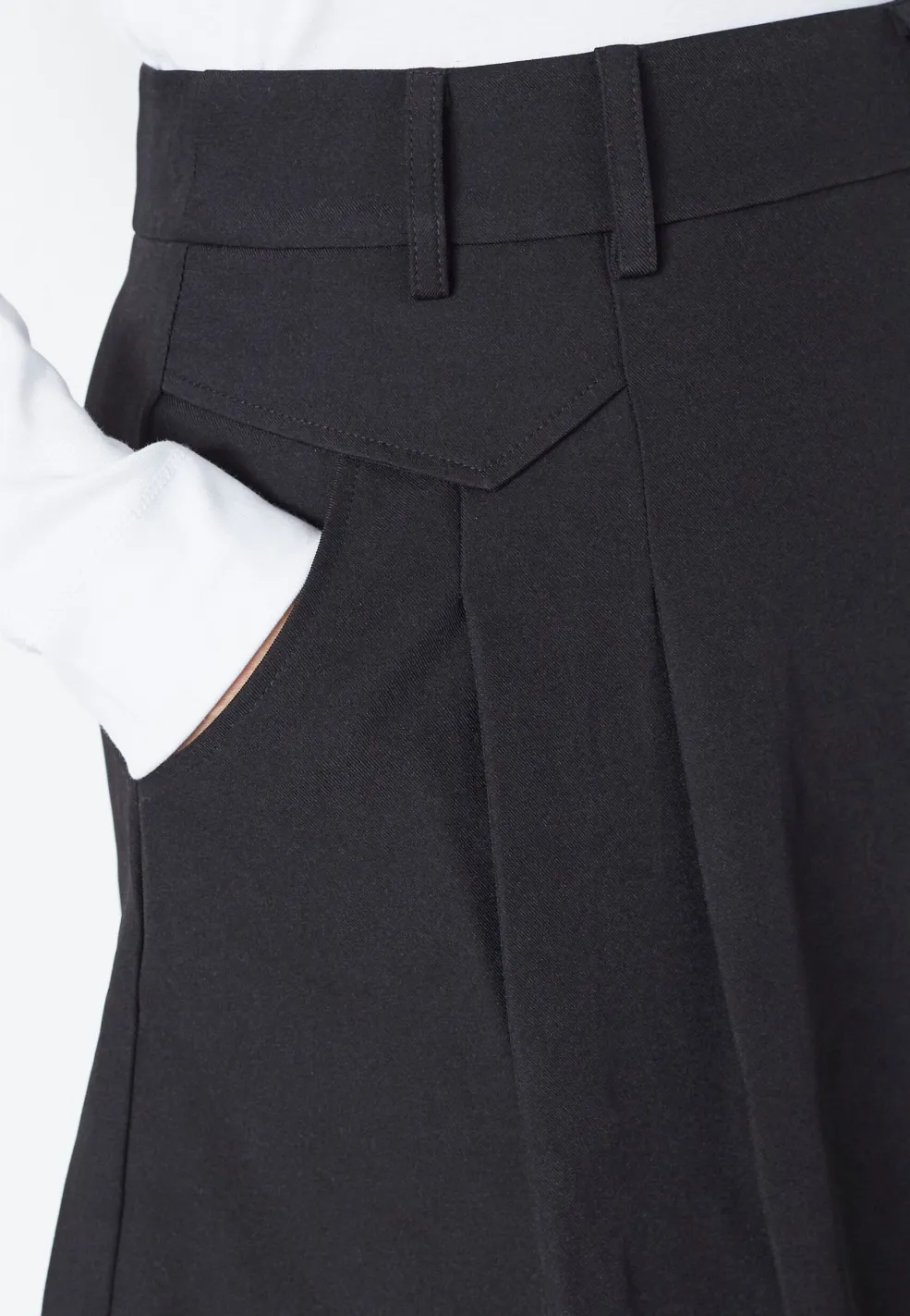 Sort miniskørt fra Co´Couture med folder foran og lommer med flapper. Nederdelen har lynlåslukning bagpå og slutter over knæet.