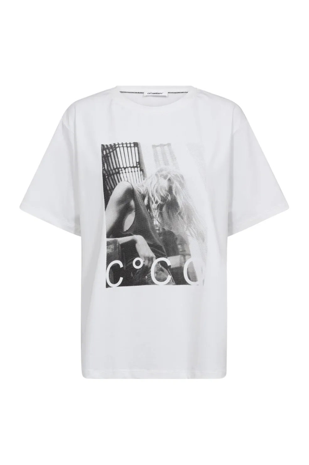 Hvid oversized T-shirt fra Co´Couture med et grafisk sort-hvidt fotoprint på forsiden. T-shirten har korte ærmer og en rund hals.