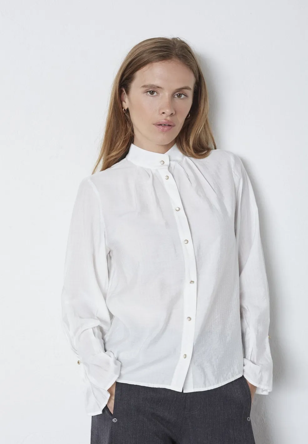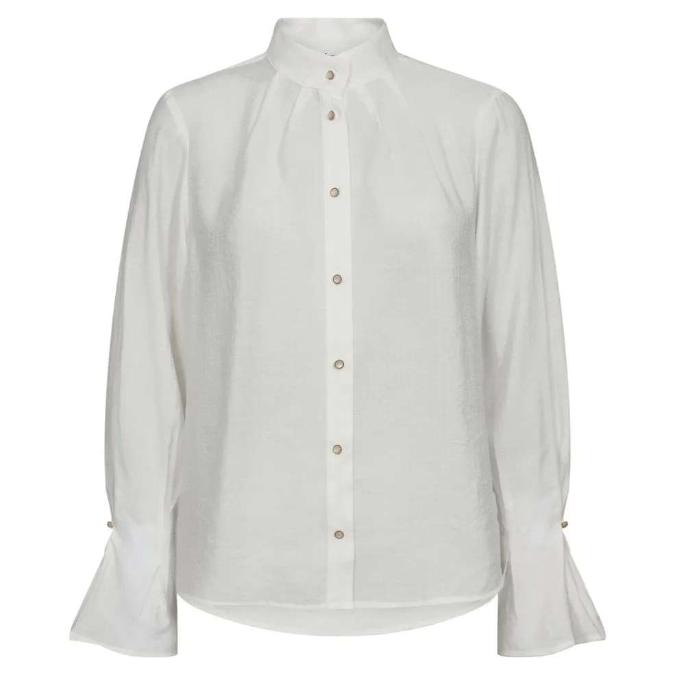 Hvid skjorte fra Co´Couture, lavet af en blanding af viskose og polyamid. Skjorten har en høj krave og flæsedetaljer foran.