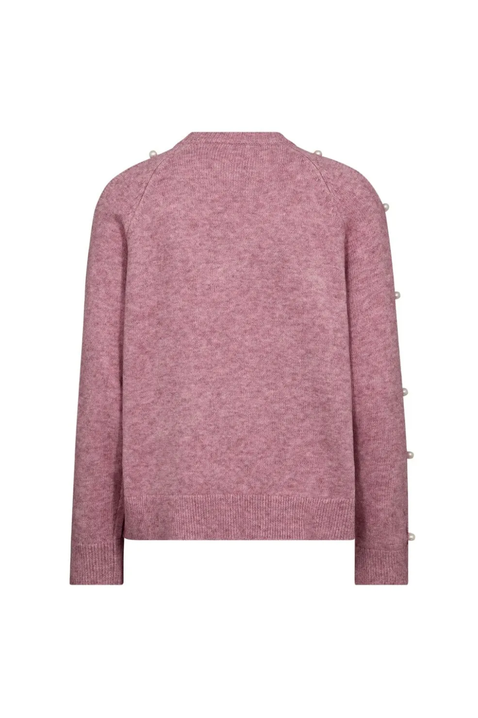 Lyserød strik fra Co´Couture med perledekorationer langs ærmerne. Sweateren har lange ærmer og rund halsudskæring. Den lyserøde farve har en meleret struktur med små lyse og mørke nuancer.
