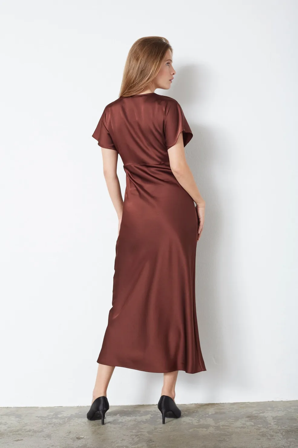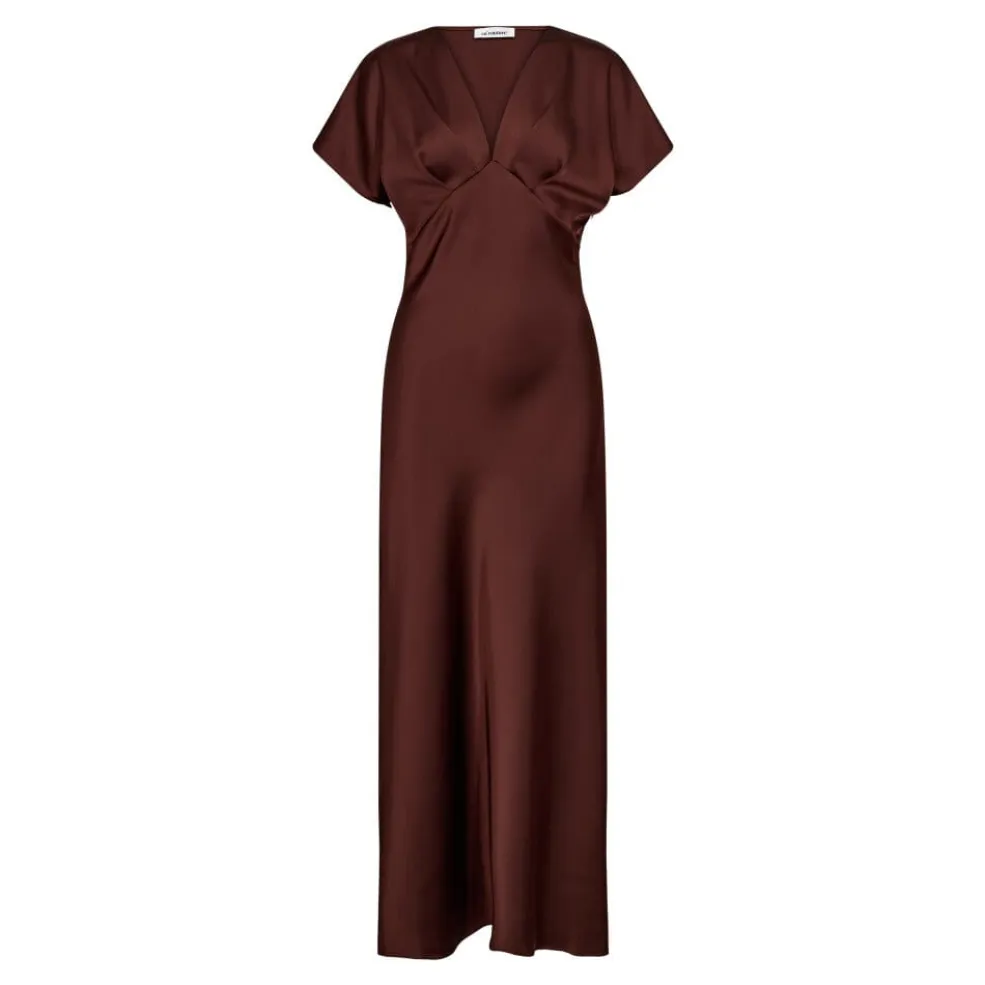 Mørkebrun kjole fra Co’Couture med V-udskæring og korte ærmer. Kjolen har en ankellang silhuet med flæsedetaljer og er velegnet til både bryllupper og andre festlige anledninger.