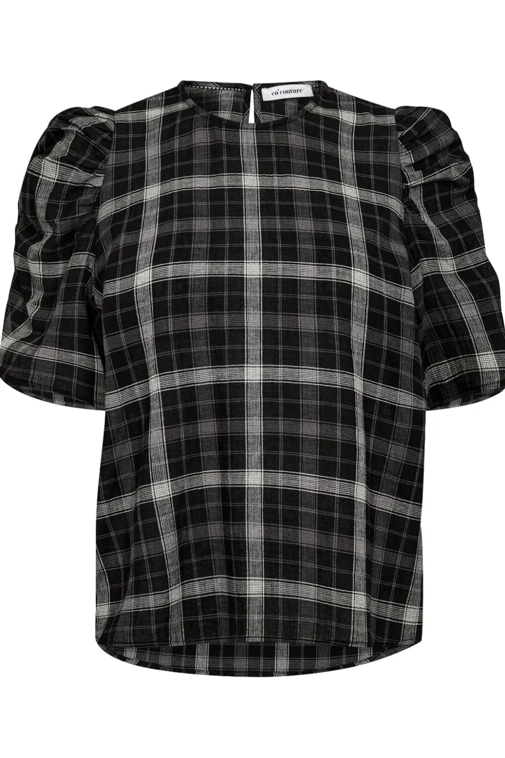 Ternet bluse fra Co´Couture i sort og grå. Blusen har pufærmer og en rund halsudskæring med knaplukning bagpå. Det ternede mønster skaber et grafisk udtryk.