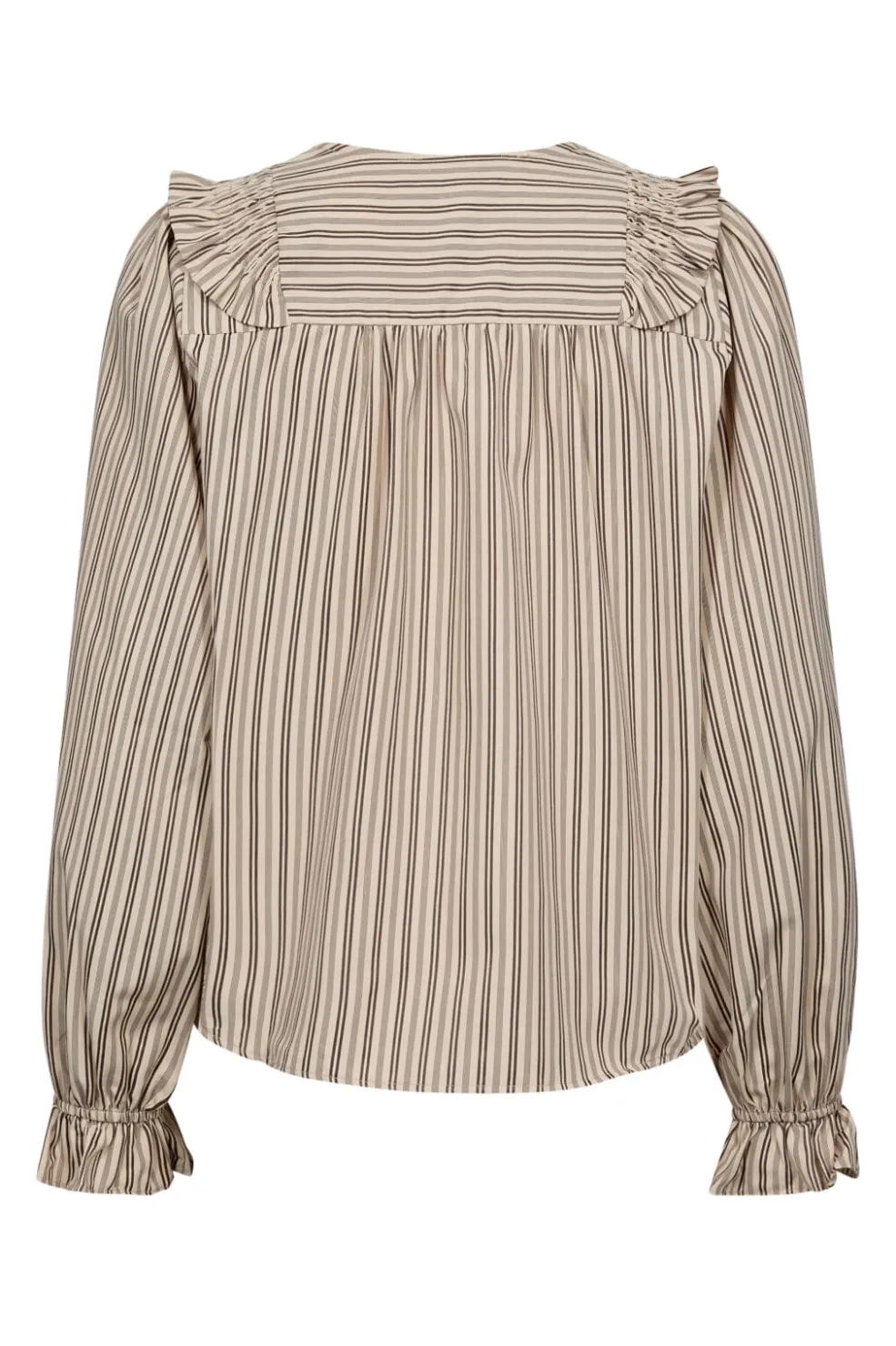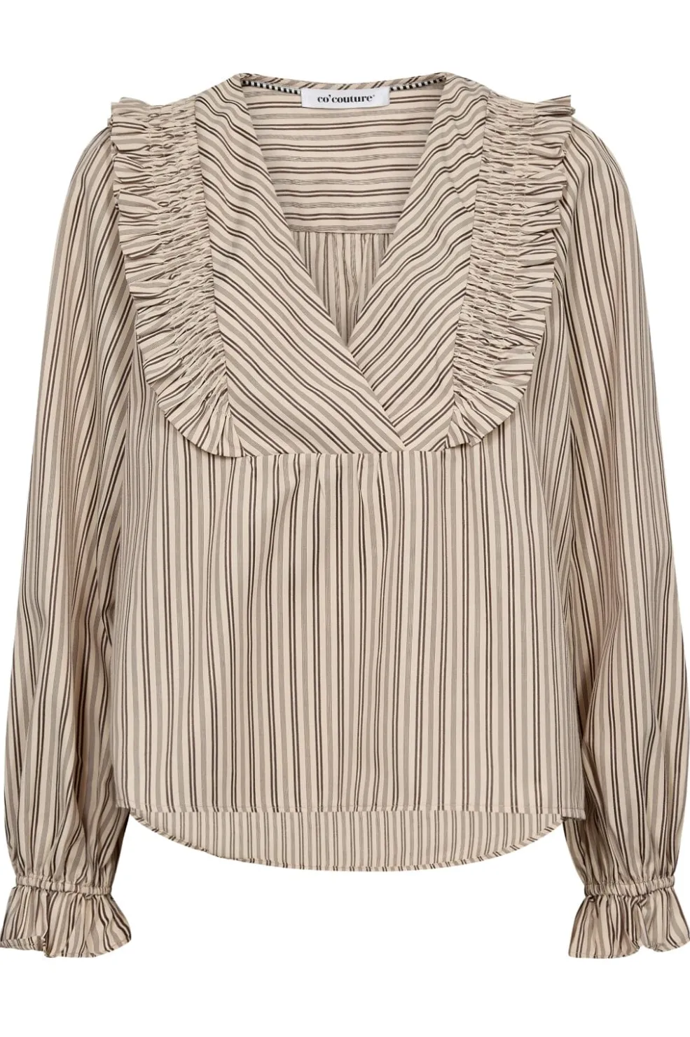 Stribet bluse fra Co´couture i pudderfarve. Den har flæsedetaljer ved V-udskæringen og manchetterne. De lange ærmer og det stribede design skaber en blød silhuet.
