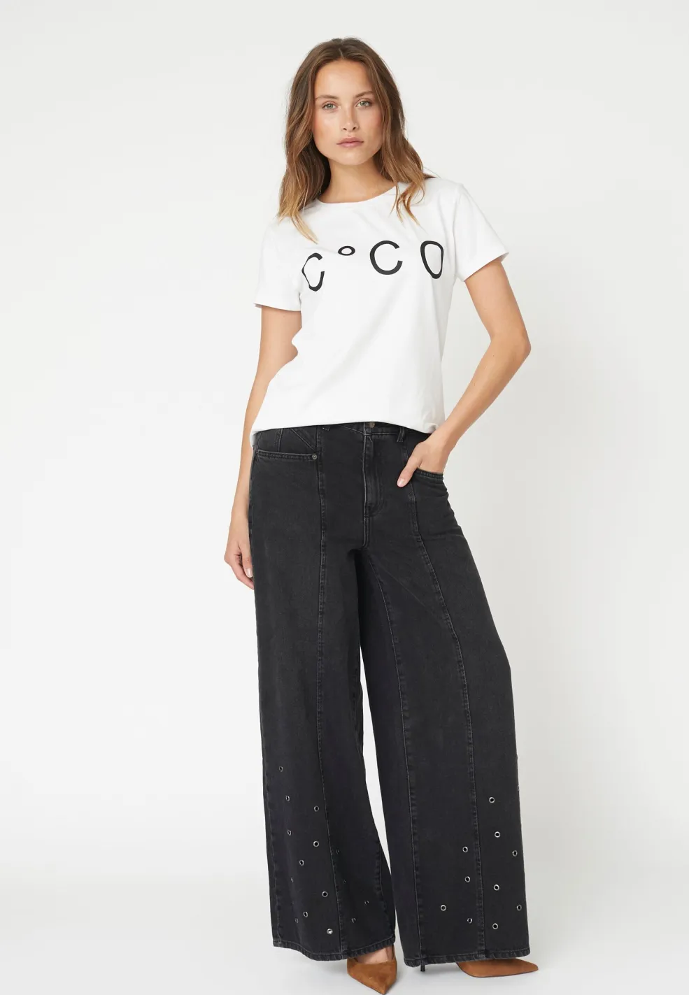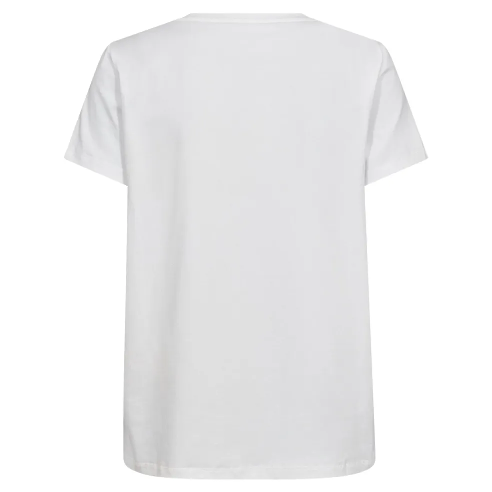 Hvid T-shirt fra Co´Couture med sort print på fronten. T-shirten er lavet af 95 % bomuld og 5 % elastan.