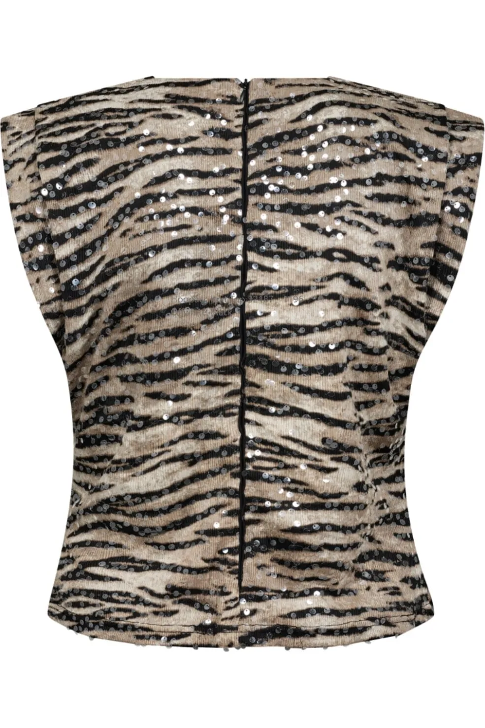 Ærmeløs top fra Co’Couture i farven bone. Toppen har et tigermønster med pailletter og en rund halsudskæring. Den er fremstillet i et let stof med glans.