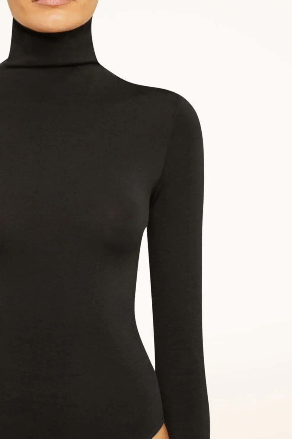 Sort body fra Wolford med høj hals og lange ærmer. Den tætsiddende pasform giver en glat silhuet under tøjet.