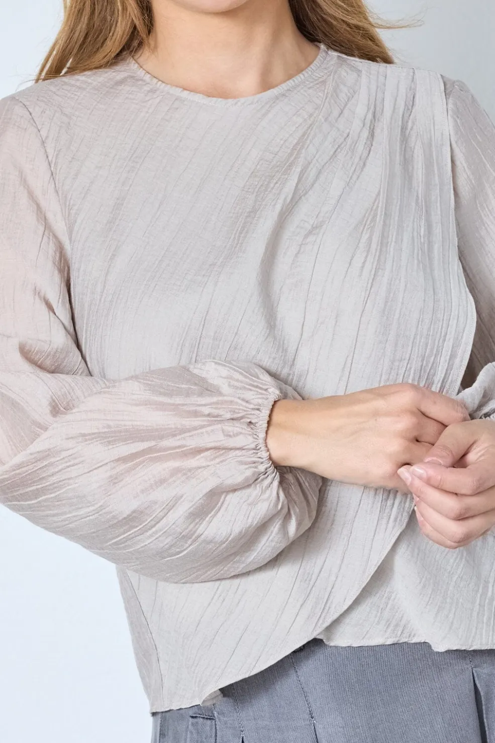 Bluse fra Co´Couture i beige-brun nuance med draperet front. Blusen har lange ærmer og en løs pasform.