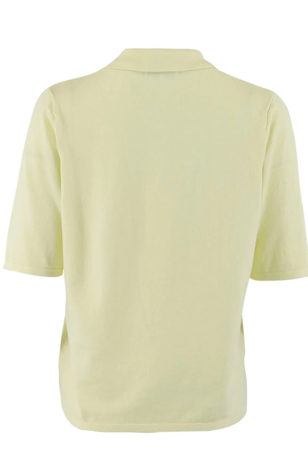 Polobluse fra Continue i en lys citrusfarve. Blusen har korte ærmer og en klassisk polokrave med knapper. Perledetaljerne på kraven giver et fint touch.