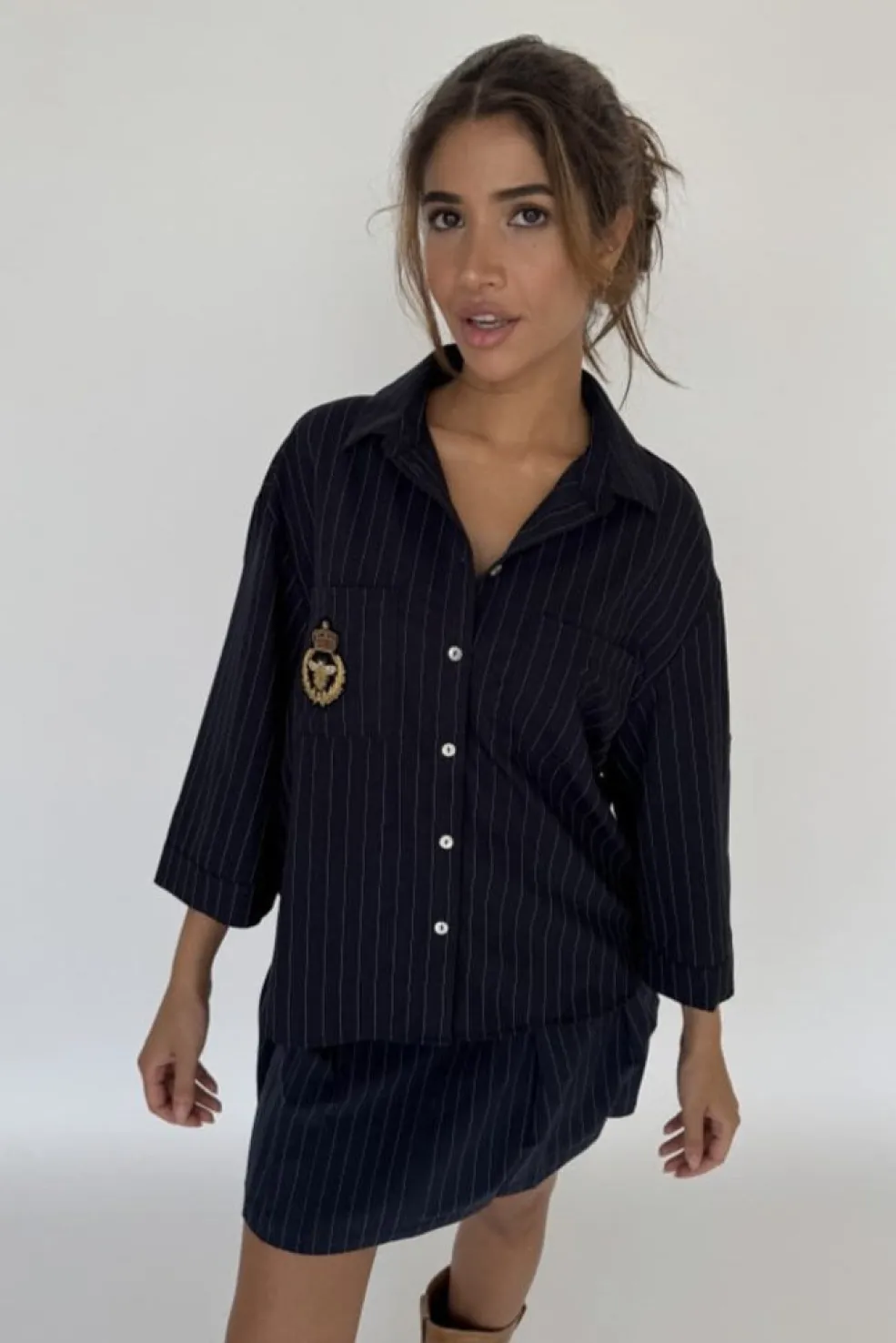 Mørkeblå skjorte fra Continue med striber og broderet patch. Skjorten har en løs pasform med 3/4 ærmer og skjortekrave, hvilket gør den praktisk til både hverdag og fest.