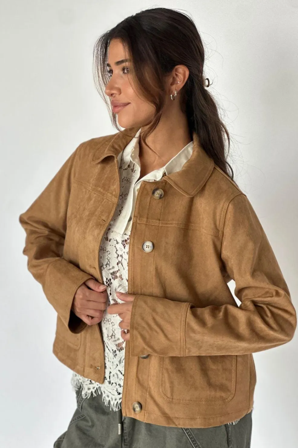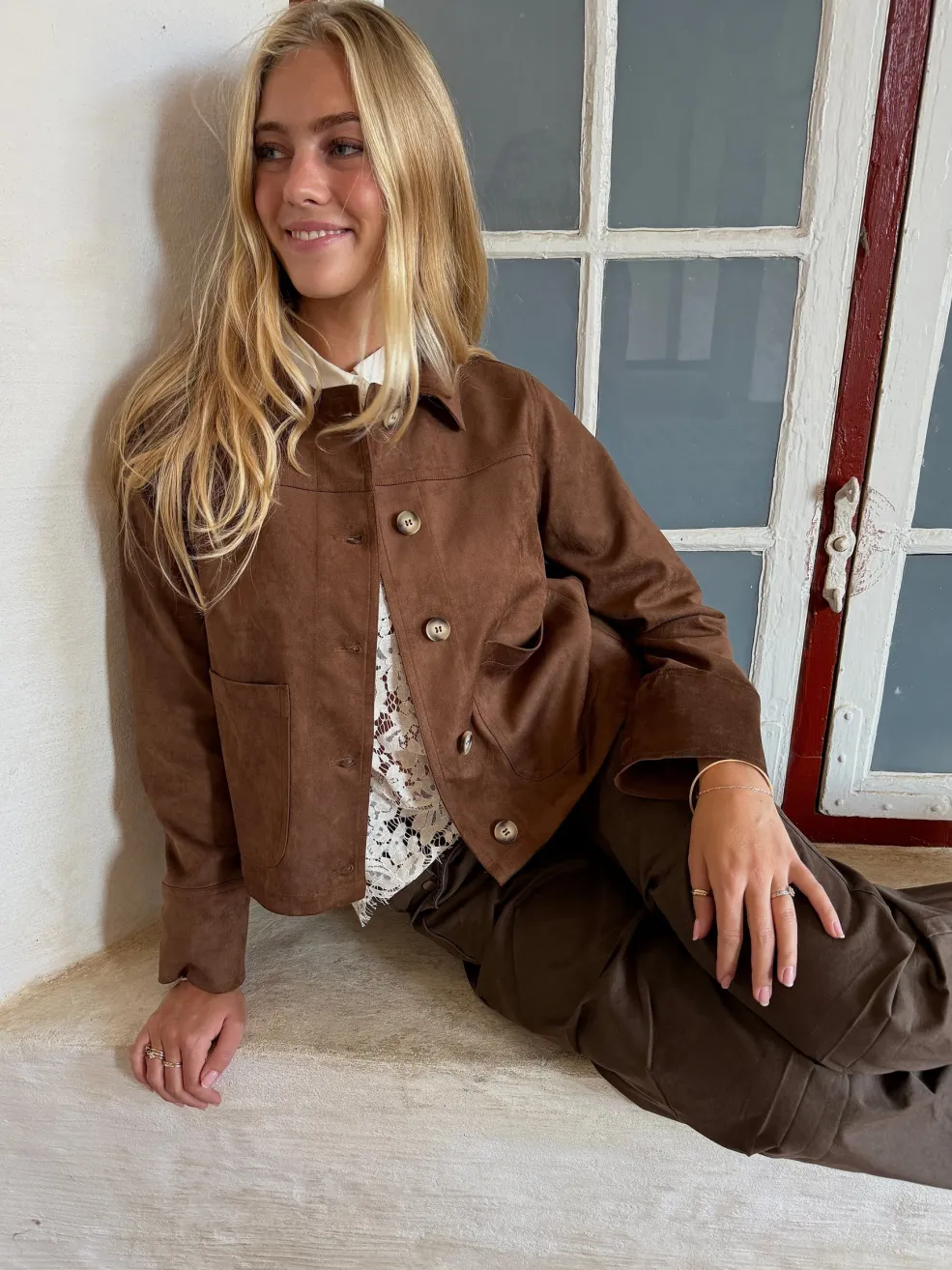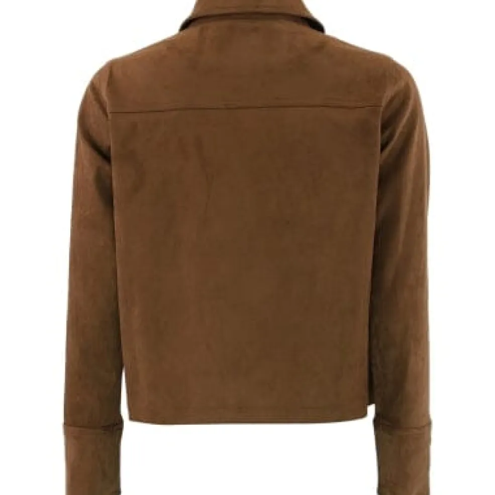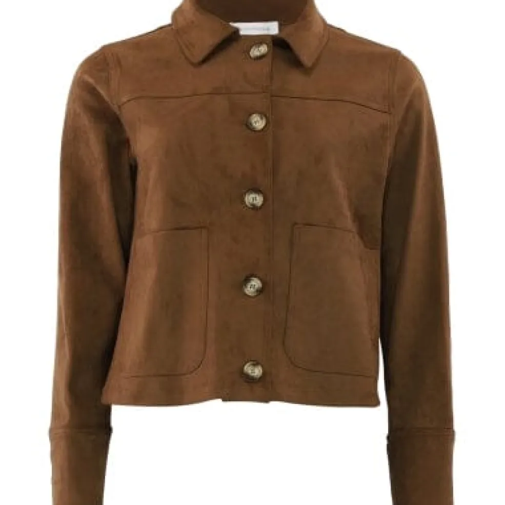 En brun jakke fra Continue med dekorative syninger, skjortekrave og knaplukning. Jakken har lange ærmer og to frontlommer.