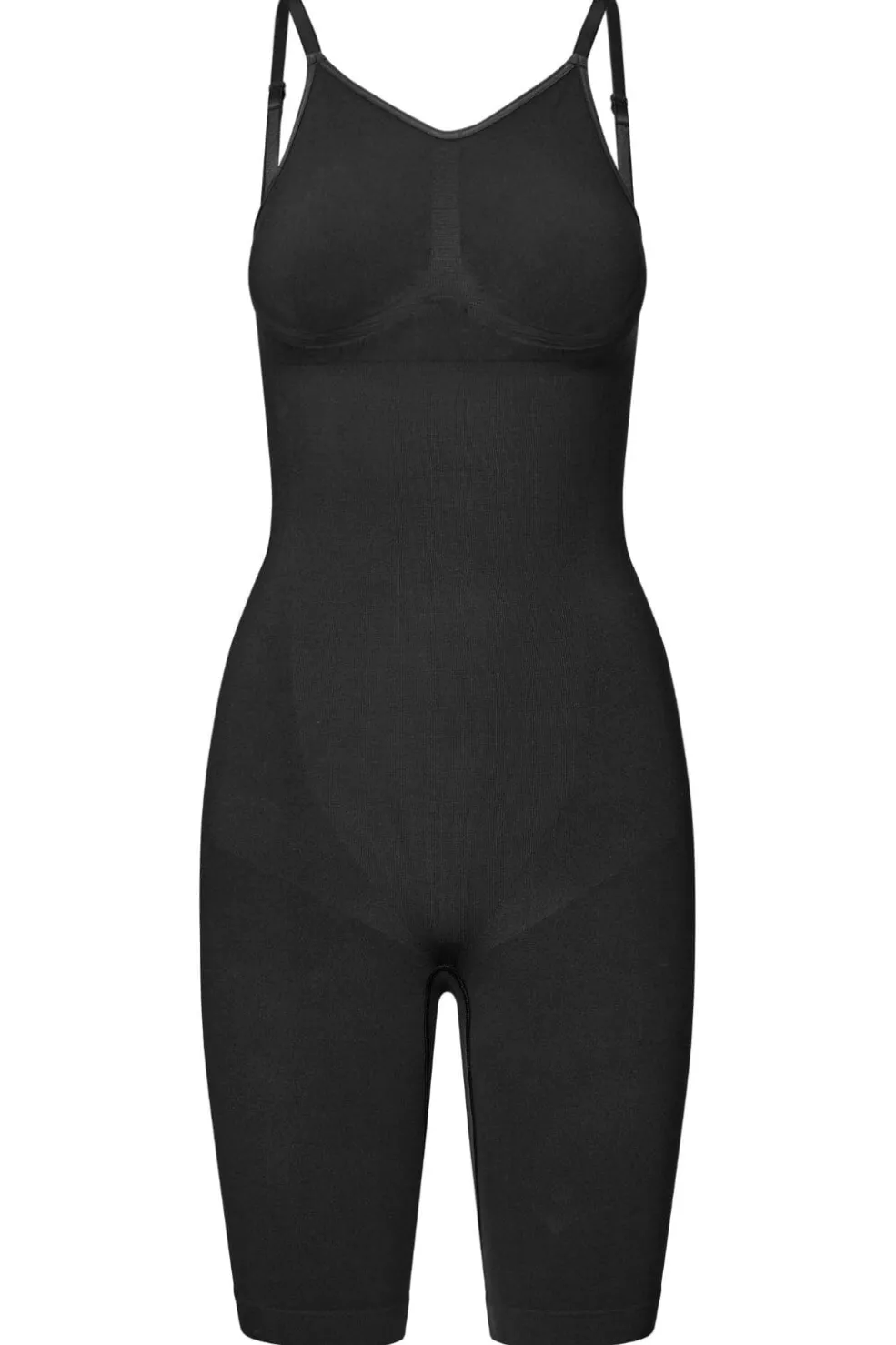 Sort bodysuit fra Lykkeland Ateliér med tynde stropper og firkantet udskæring. Den tætsiddende model går til midt på låret og kan bruges under tøjet.