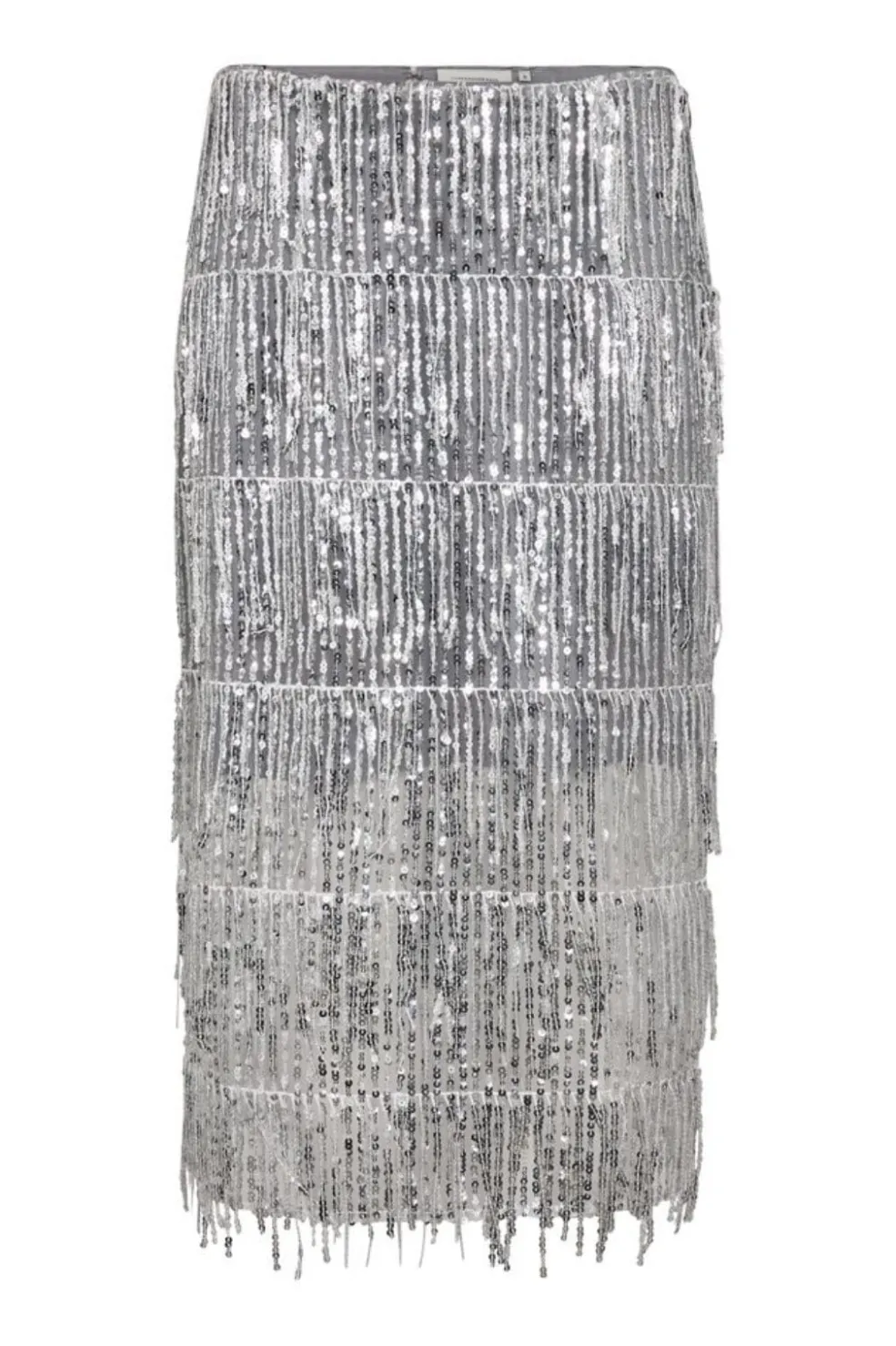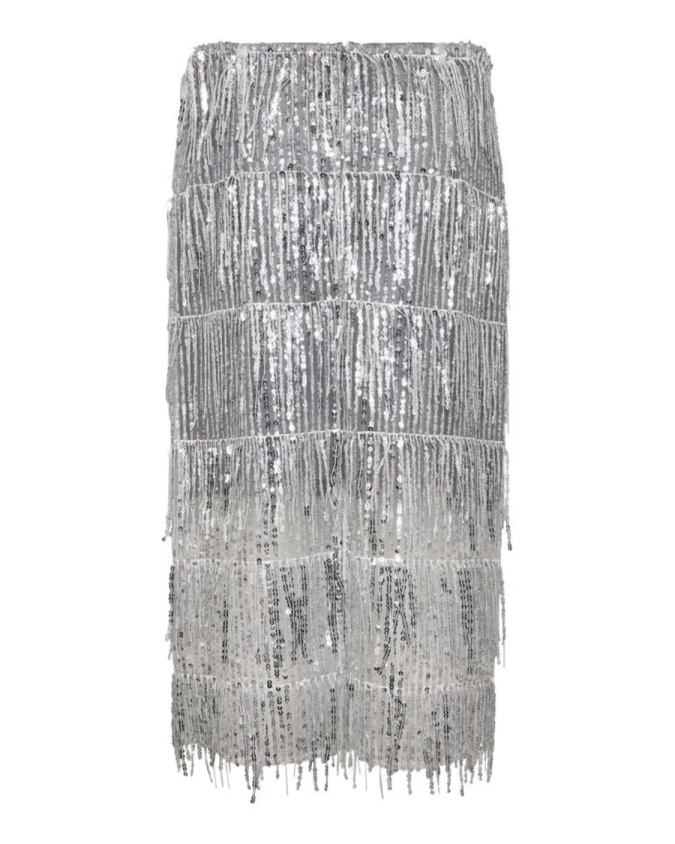 CMSEQUOIA-SKIRT er en lang pencilnederdel i et eksklusivt meshmateriale udsmykket med pailletter, der skaber en elegant frynseeffekt forneden. Nederdelen er desuden fuldt foret og har en skjult hægtelukning og lynlås bagpå.