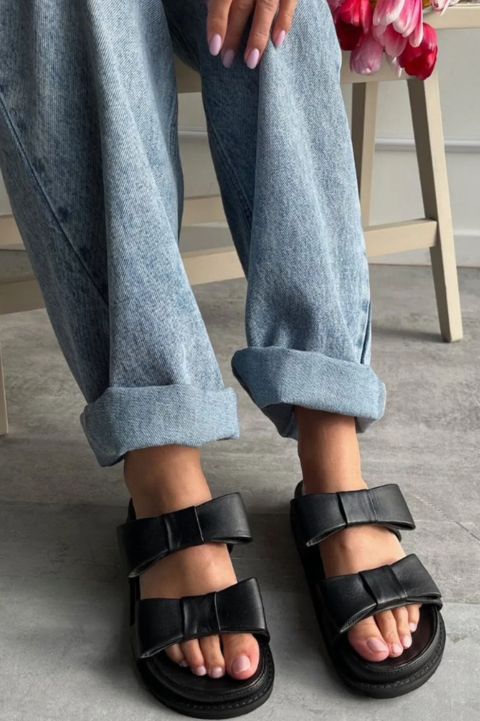 Sort lædersandal med to brede bånd formet som sløjfer på oversiden. Sandalen har en flad sål og er fremstillet i blødt læder, der former sig efter foden.