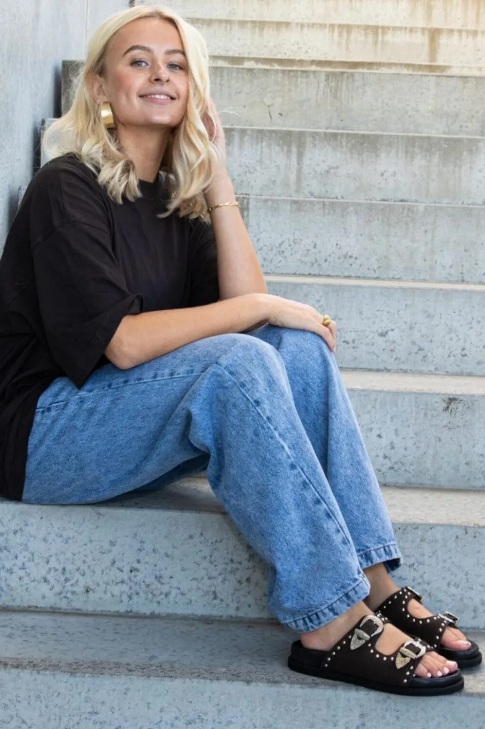 Mørkebrun sandal fra Copenhagen Shoes i ruskind med to spænder og nitter langs kanten. Sandalen har en flad sål og åben tå.