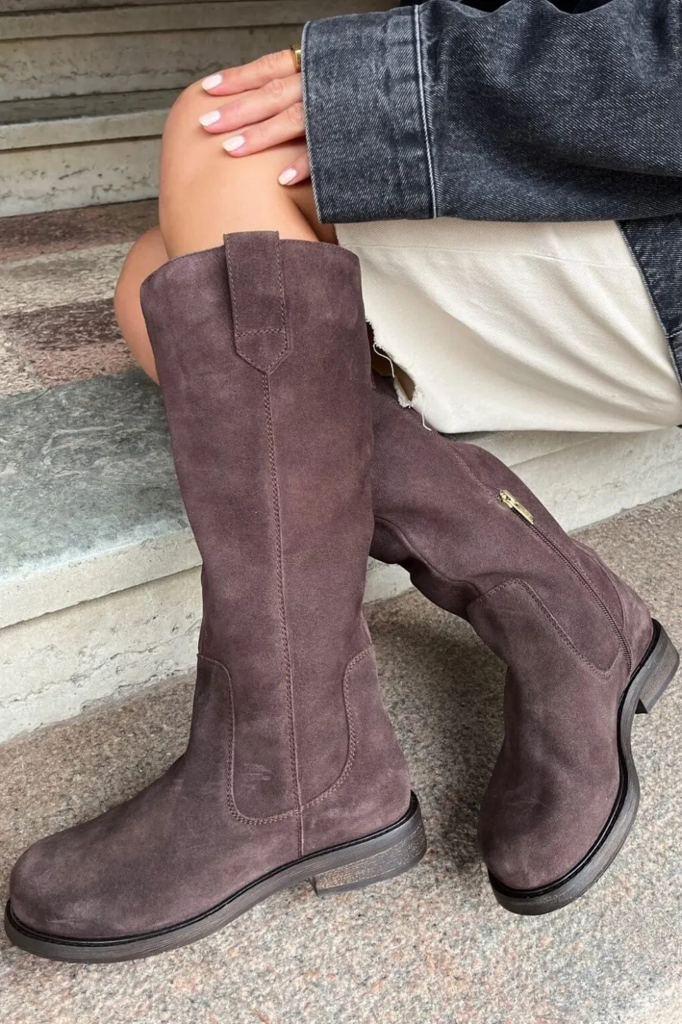 Knæhøj støvle i brun ruskind med rund tå. Støvlen har en lav blokhæl og lynlås i siden. Den brune nuance giver støvlen et rustikt udtryk.